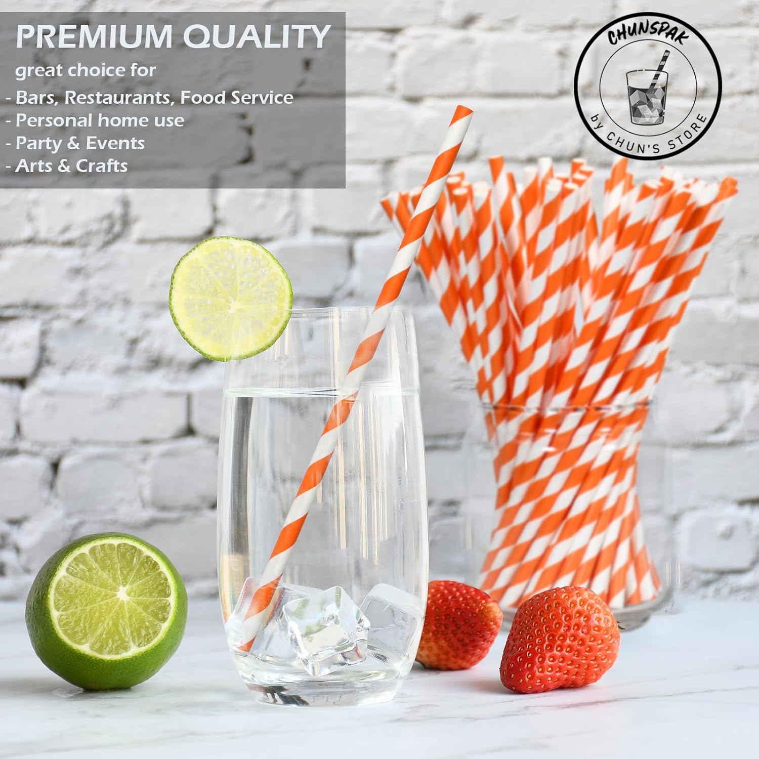[1000 Count] Chunspak Orange/White Striped Paper Drinking Straws Bulk - 7.75"x0.24", Unwrapped - Biodegradable and Compostable