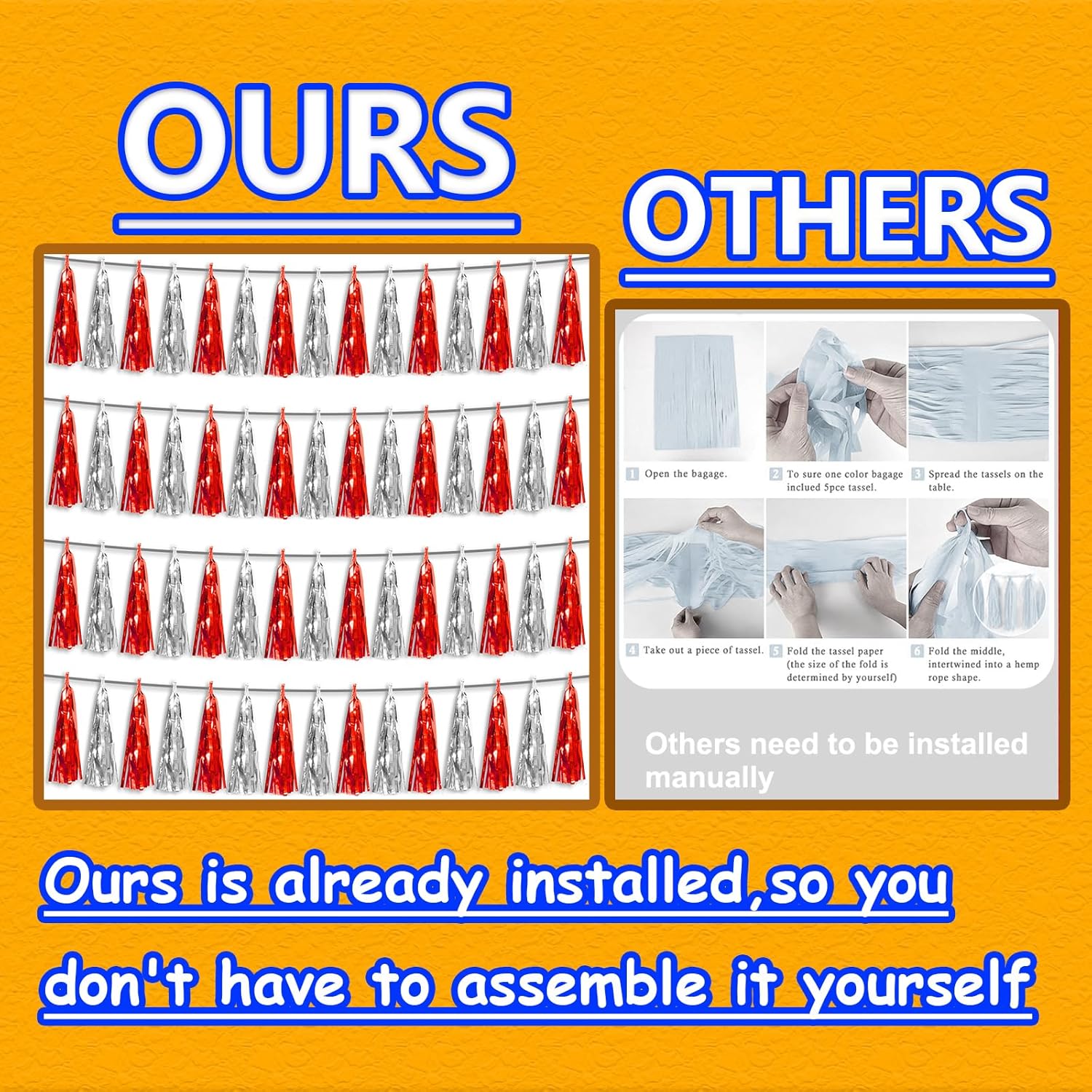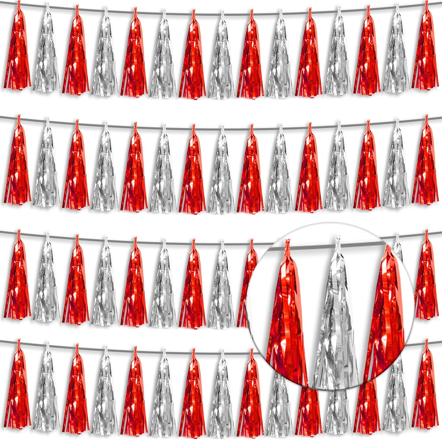- 【Package Includes】The total length of the red silver birthday tassels banner is 40 feet, divided into 4 strips, each 10 feet long. Each banner contains 15 tassels, and each tassel measures 14 inches, for birthday decorations many occasions uitable for Patriotic display, Homecoming Float, Christmas Float, ecorative metal trailers, graduation floats etc