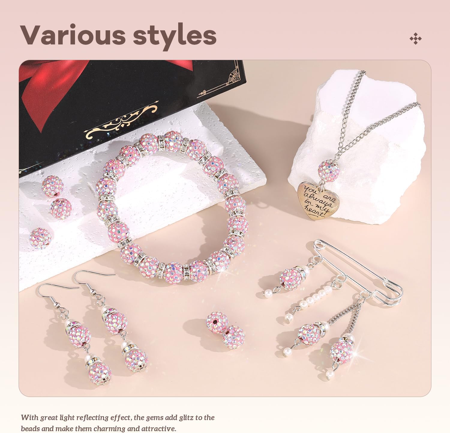 200pcs 10mm Rhinestone Beads for Jewelry Making, Pink AB Shiny Round Disco Ball Beads Bulk, Sparkle Crystal Clay Christmas for Bracelet Baseball Necklace Earring Crafting and DIY