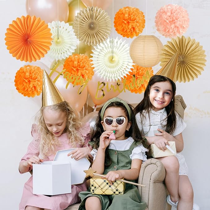 SUNBEAUTY Orange Birthday Party Decorations for Girls Women with Happy Birthday Banner Fall Hanging Paper Fans Tissue Pom Poms Lanterns for Thanksgiving Harvest Friendsgiving Autumn Wedding Decor