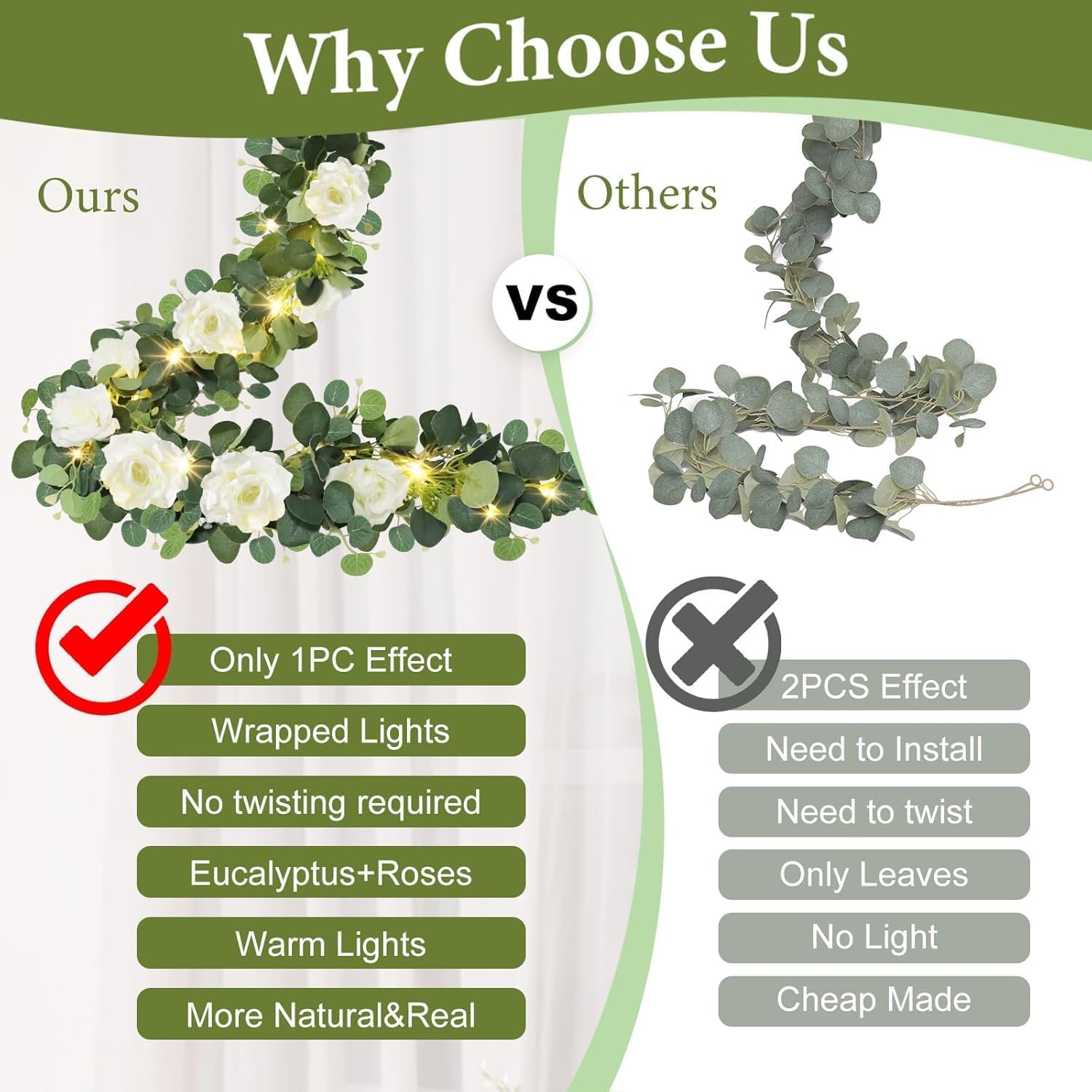 - Eucalyptus Garland with Built-in LED Lights: Transform any space into a magical setting with our 6.6FT eucalyptus garland, now upgraded with built-in led lights! Whether decorating a wedding arch, table centerpiece, fireplace mantel, backdrop, or outdoor garden fence, this rose flower garland brings timeless elegance and a touch of romance to any occasion. The versatile design allows for endless creative possibilities, making it perfect for weddings, Valentines Day, Mothers Day or seasonal celebrations