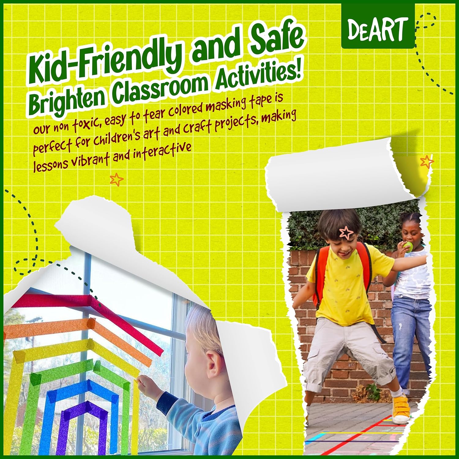 - 🌈【Fun Supplies for Kids】These vibrant masking tapes promise endless fun for your children while fostering their creativity and imagination. Let them explore the possibilities of creating wall murals, engaging in DIY crafts, crafting party decorations, designing scrapbook pages, and crafting journal stickers. It Can Be Written On With Pen, Pencil, Marker, etc.