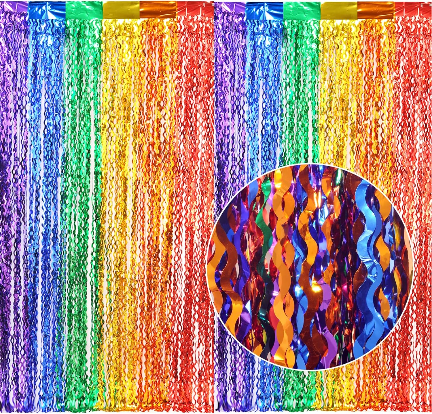 - LATEST Shiny Surface and Wavy Shape Tinsel Backdrop:The colorful foil curtain backdrop each pack with 6 color purple blue green gold orange red connected, made of aluminium foil wavy shape, good for adding sparkle as decorations for parties
