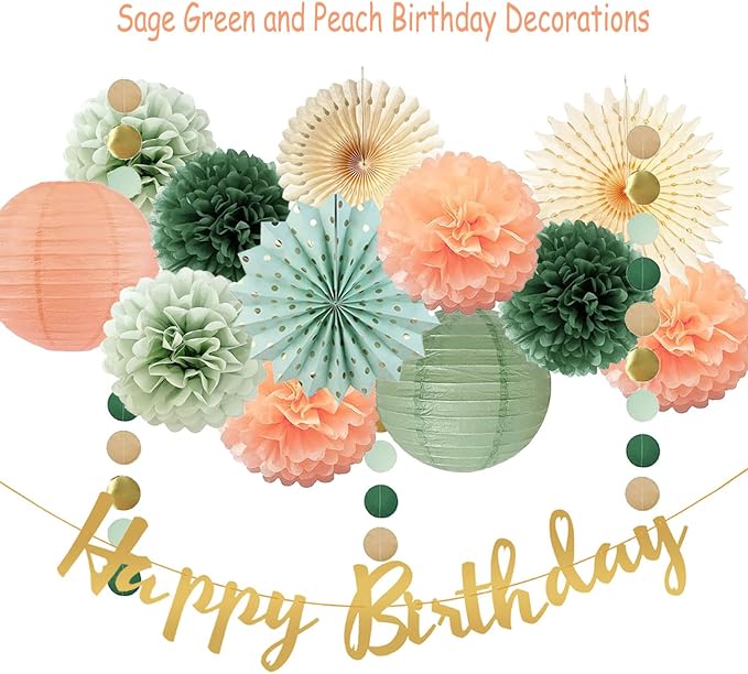 - Sage Green Peach Birthday Decorations: 1 pc gold happy birthday banner, 7 pcs 10inch paper pom poms(2 sage, 2 dark olive green, 3 peach), 2 pcs 10inch paper lanterns(1 sage, 1 peach), 3 pcs hanging paper fans(1 sage, 2 cream), 1pc 4m sage green and gold circle dots garland.
