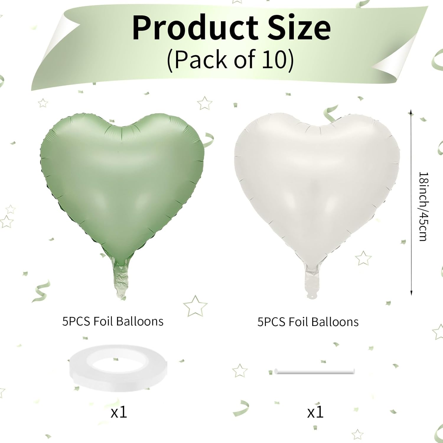- 10 PCS Sage Green White Heart Balloons: Our package contains 5 x 18 inches green heart shaped balloons, 5 x 18 inches beige heart shaped balloons, 1 x 10m ribbon. The olive green cream white foil heart balloons are specially designed to add a touch of fun and surprise to any party or holiday celebration. With a size of 18 inches, they are the perfect addition to your decorating needs, leaving your guests with an unforgettable smile!