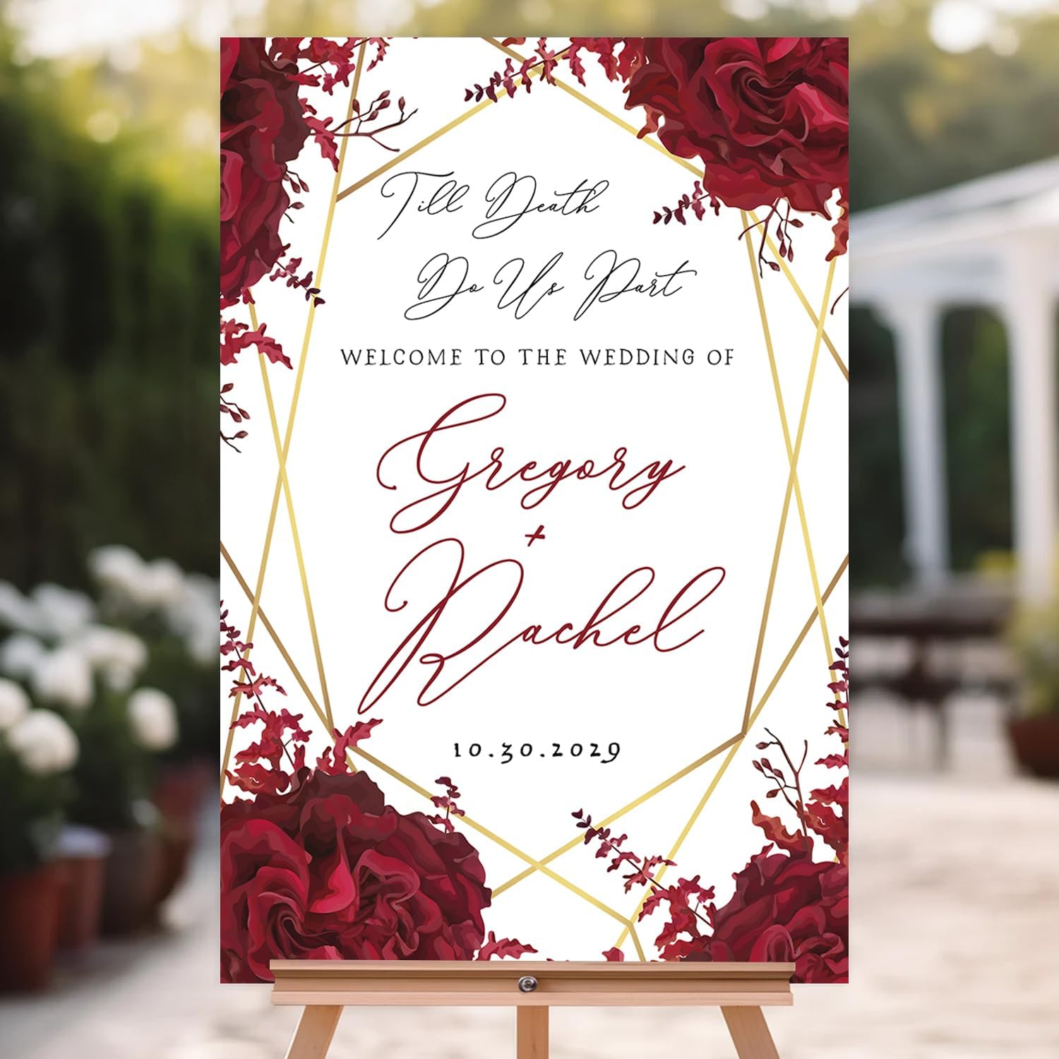 - A stunning choice for those planning a Gothic-inspired wedding or a Halloween-themed celebration. Whether you're exchanging vows on All Hallows' Eve or simply love the allure of Gothic aesthetics, this welcome sign will captivate your guests and make a bold statement.
