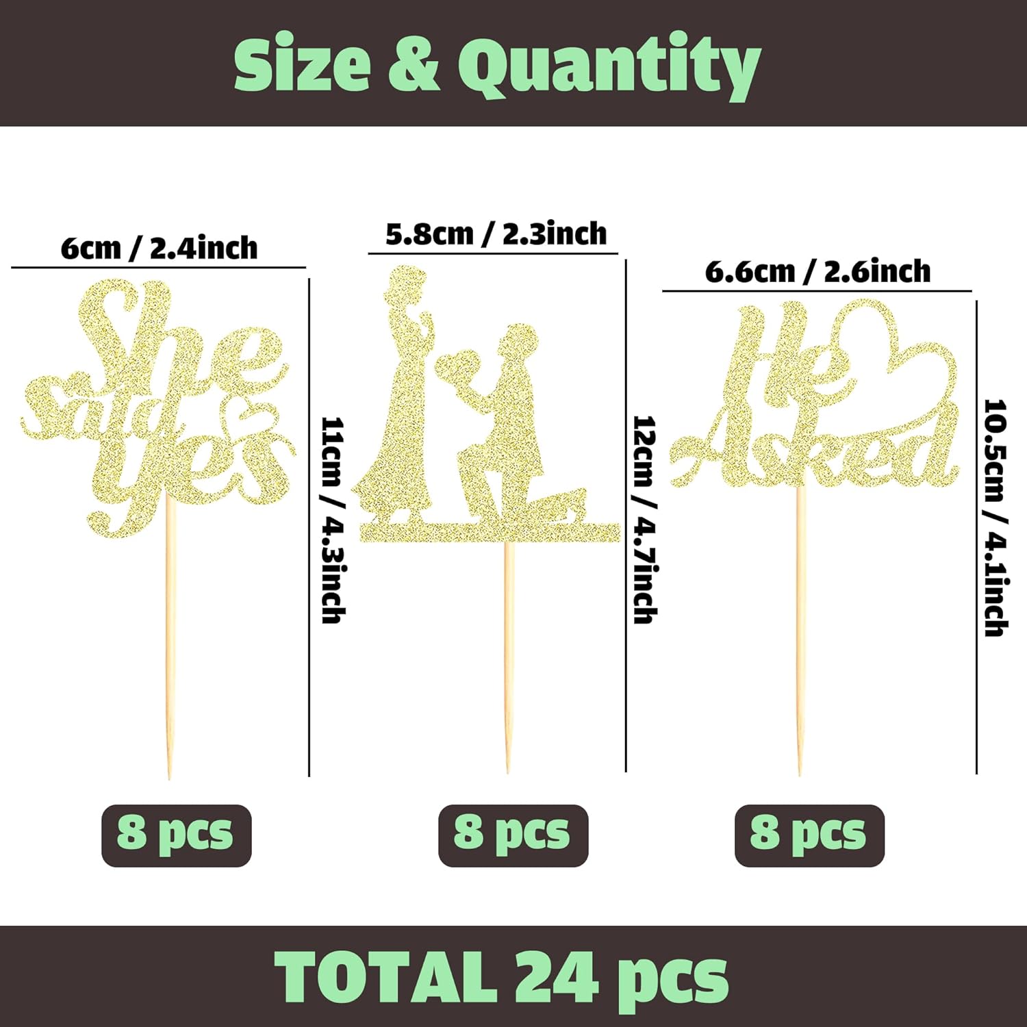- Package Included: 3PCS Gold Glitter He Asked She Said Yes Cupcake Toppers add "propose" sign. Already assembled so you can insert into wedding engagement party decoration, which make your cake icing on the cake. Size: W 2.3 inch * H 4.72 inch / W 6 cm * H 12 cm(Including Stick)
