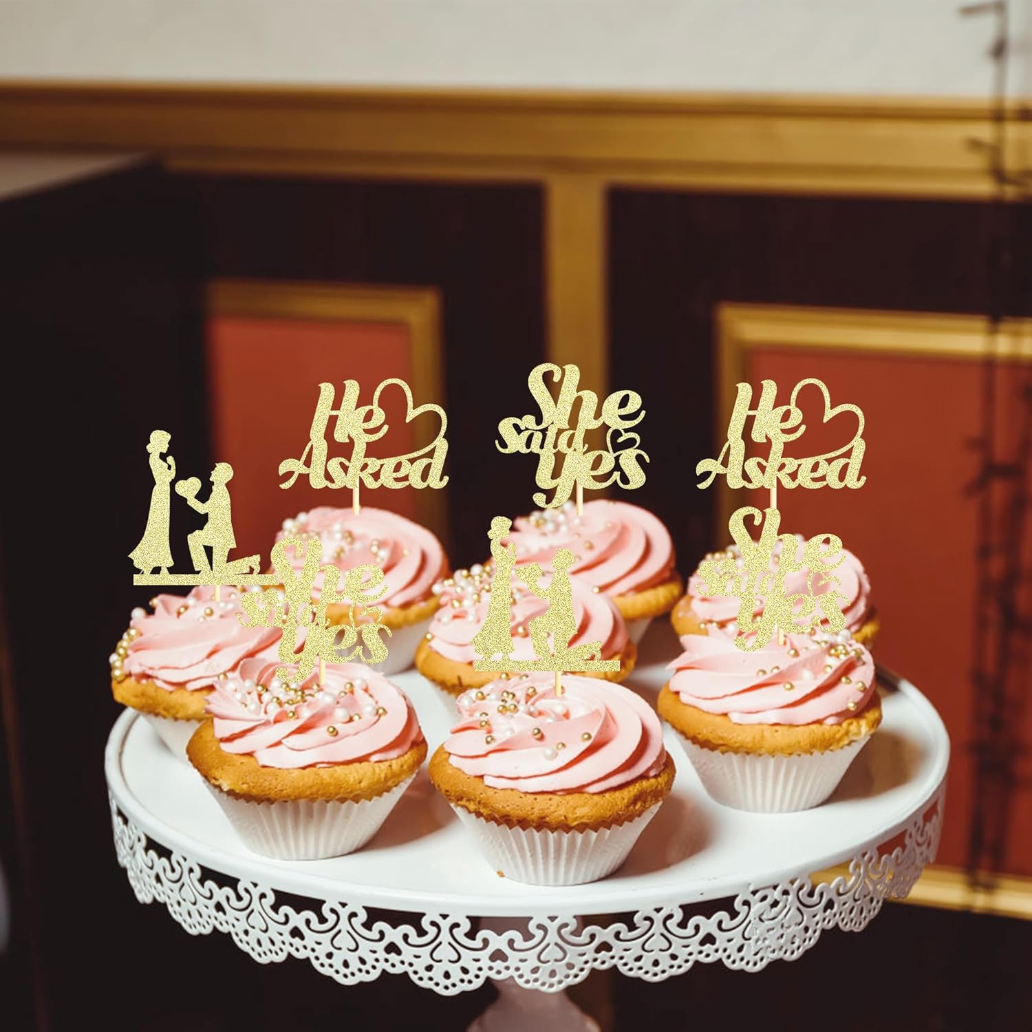 - Unique Design:This gold 24PCS He Asked She Said Yes Cupcake Toppers to make your Wedding Engagement party stand out! The delicate design like your a match made in heaven makes your dessert look more romantic. Shimmering glitterscreate a lovely and sweet feel for your wedding party