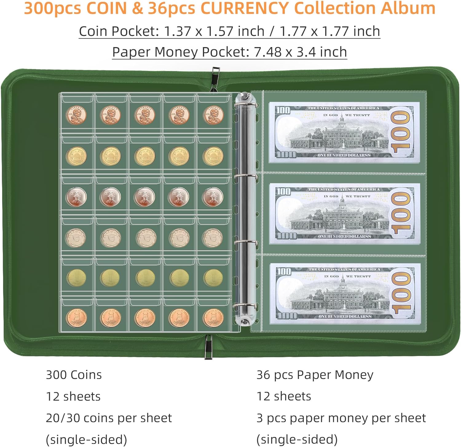 Coin Collection Book Holder for Collectors, 300 Pockets Fireproof Coins Collecting Album & 36 Sleeves Money Storage Case for Coin Currency Collection Supplies, Bill, Pennies, Quarters, Stamp,Green