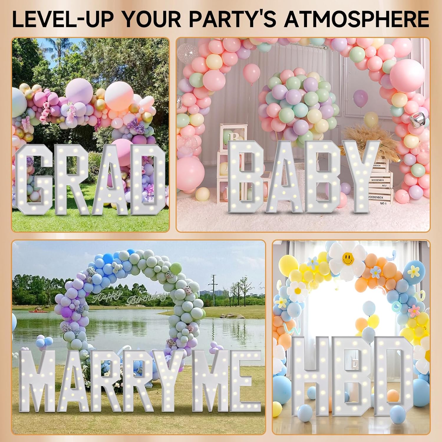 - 【Incredible Party Decoration】The 4ft marquee letters are ideal for elevating the ambiance of party decorations, such as birthday party (1st, 16th, 21st, 30th, 40th, 50th, 60th, 70th), 2025 graduation prom party, engagement, baby shower, proposals, wedding, anniversary, new years eve. Leaving a lasting impression on your guests by featuring DIY giant letters as the backdrop