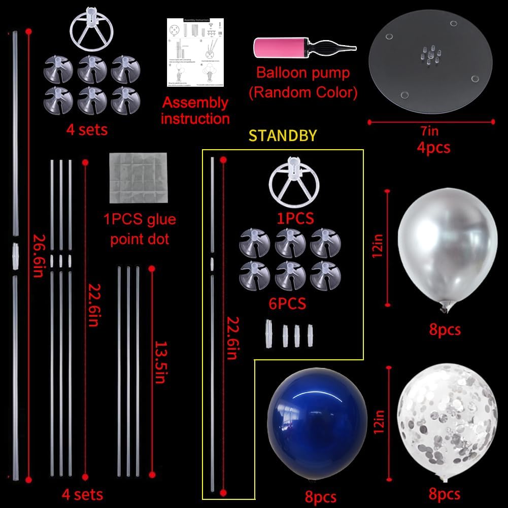 - Package Includes: The balloon stand kit includes 4 reusable balloon centerpiece table decorations and 12 inch 32 pcs Latex Balloons (8 silver balloons,8 grey balloons,8 dark blue balloons,8 silver confetti balloons),glue point dots,balloon pump,balloon clips,and tie tool.You don’t need to waste money to buy balloons