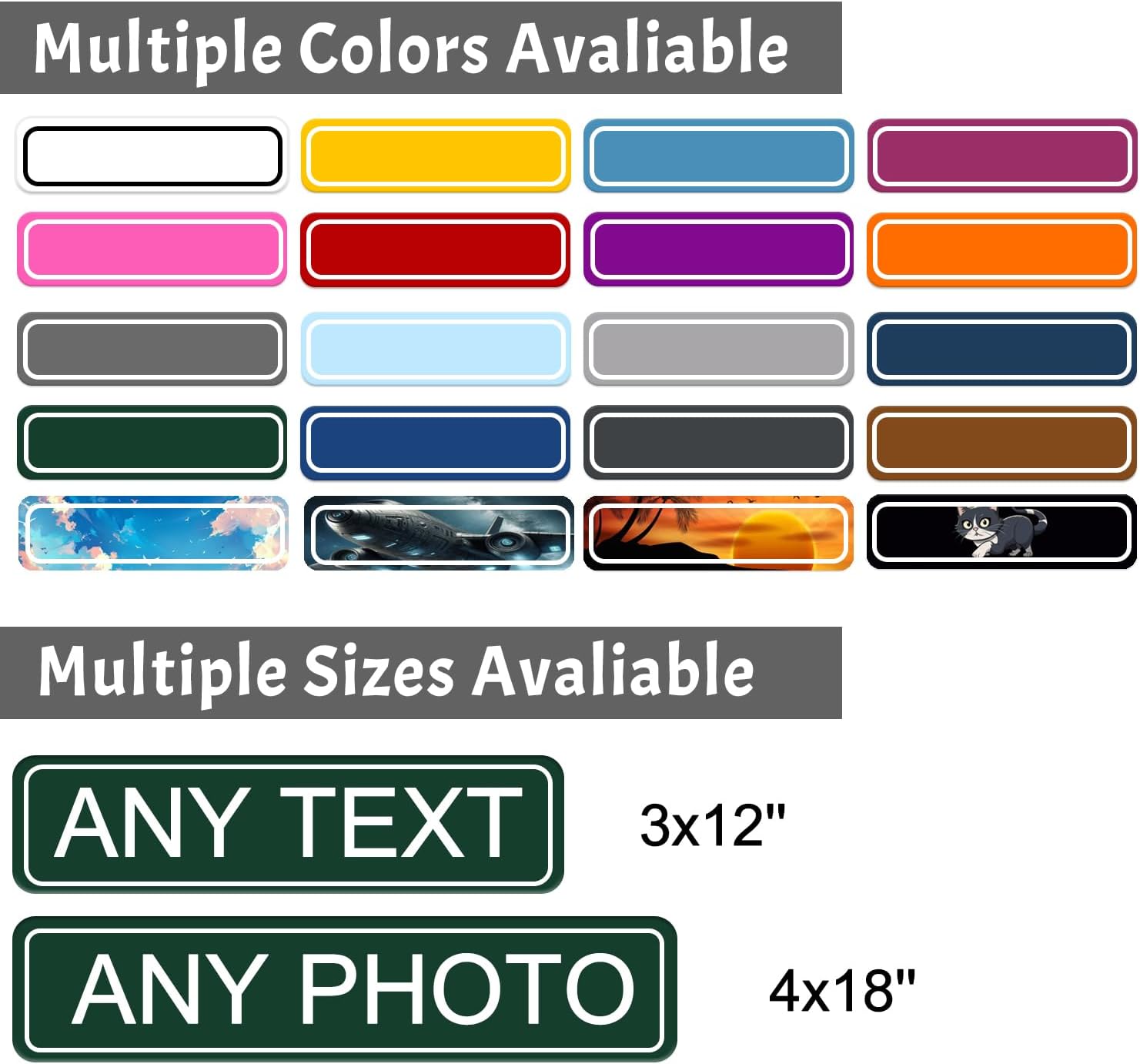 - PRODUCT CUSTOMISATION: Choose from four sturdy sizes: 3 ‘x12’, 4 ‘x18’, 10 ‘x14’ and 12’ X 18, and choose between a wide range of custom fonts and a variety of background text to create a high-quality metal sign that fits any style.