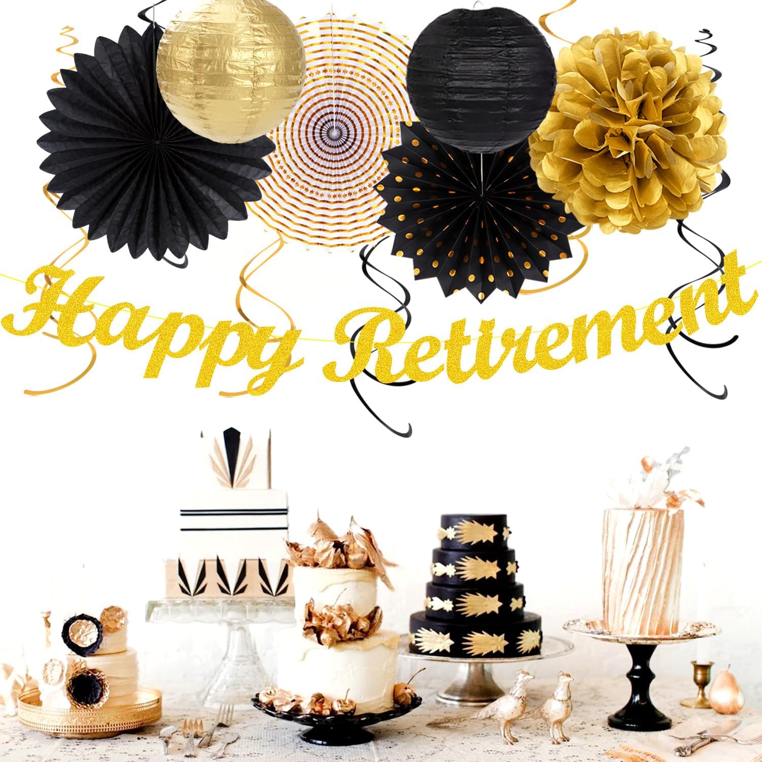 - 【Black Gold Retirement kits】This kits include 1pcs happy retirement banner, 1pcs circle dots paper banner, 4pcs tissue pom poms: 3pcs 10" and 1pcs 12" , 3pcs 8inch paper honeycom ball, 2pcs 8inch paper lantern, 4pcs 12inch paper flower fan, 6pcs Paper swirls hanging streamers