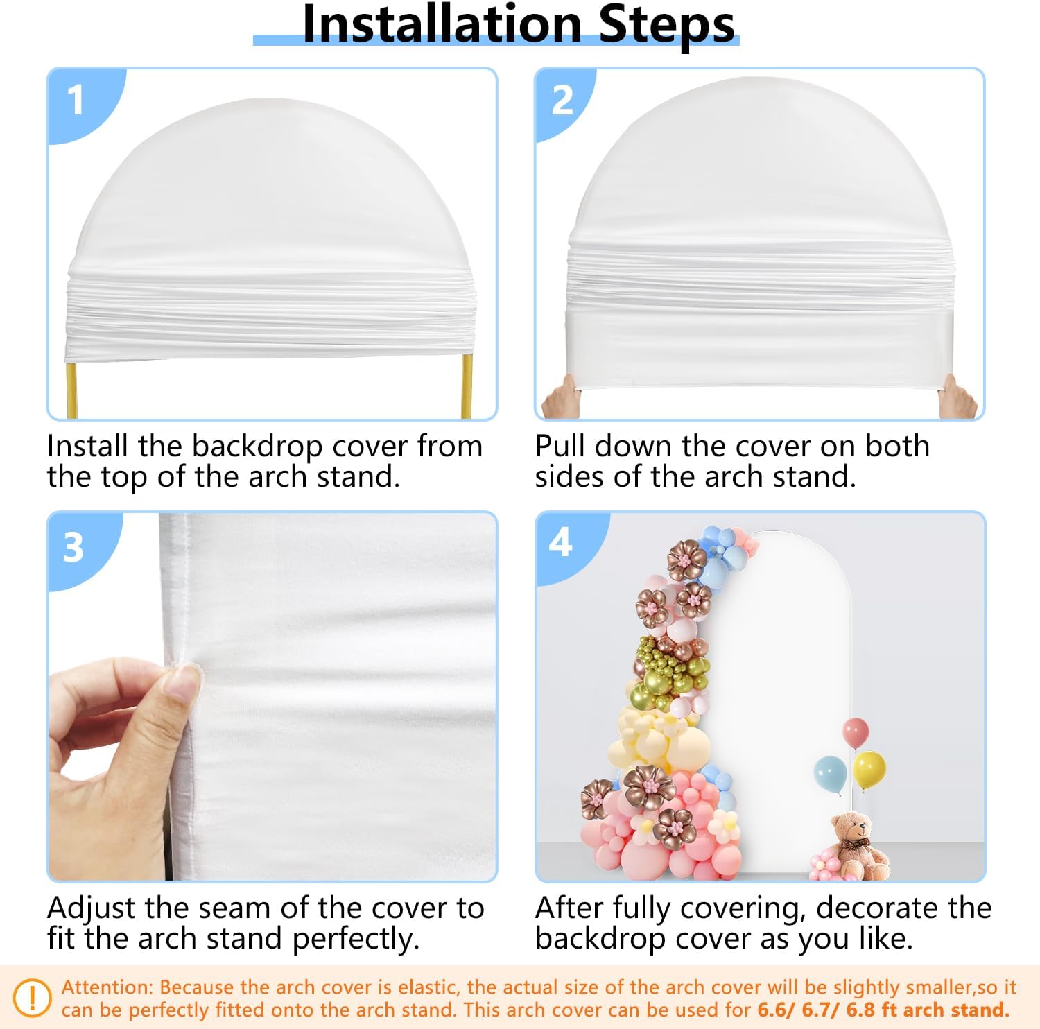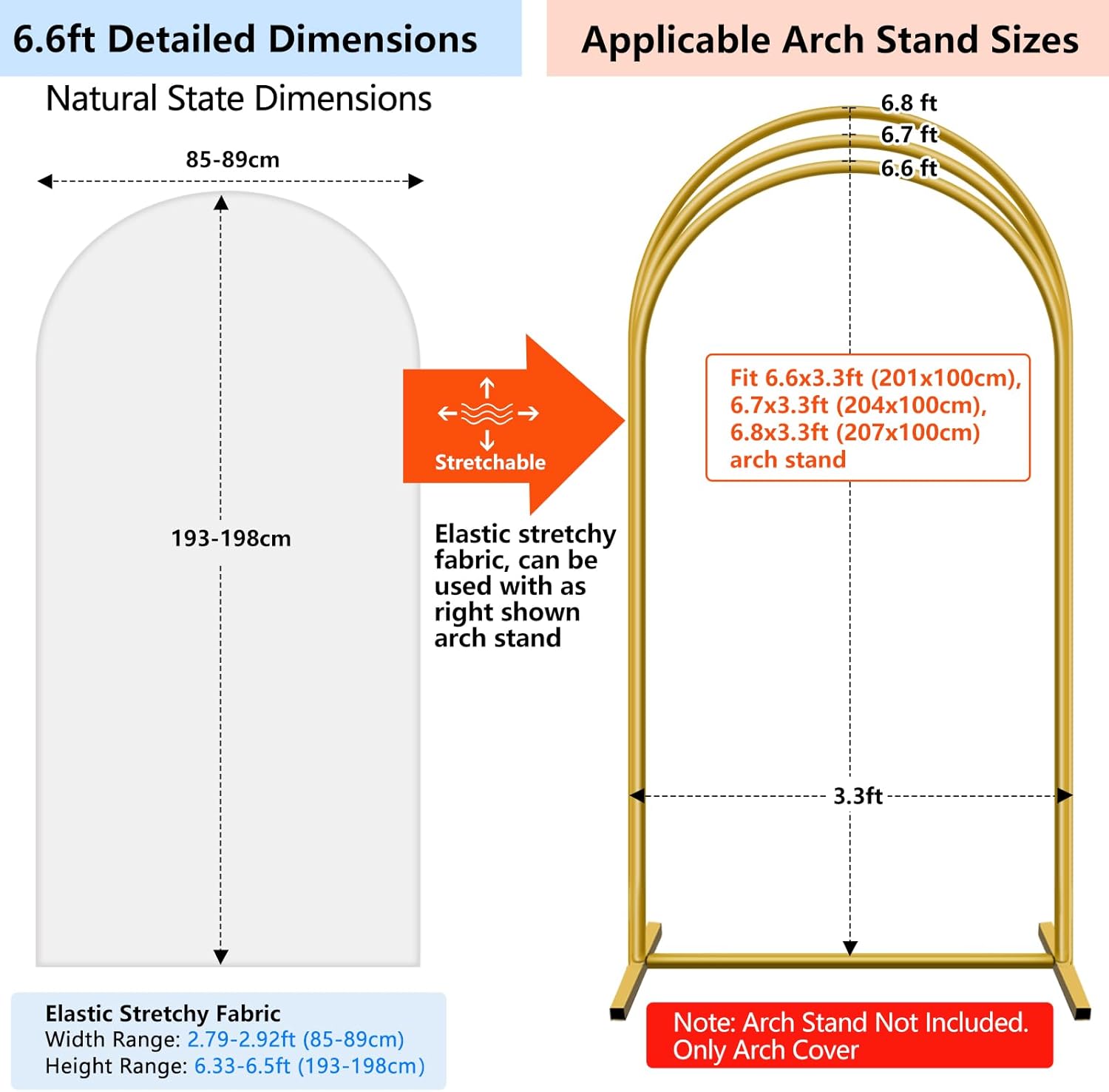- Attention: ⚠️ This package only includes one piece of arch cover. Arch stand is not included. ⚠️ Please confirm the arch stand size you have on hand and the stand size that our arch fabric is suitable for before purchasing
