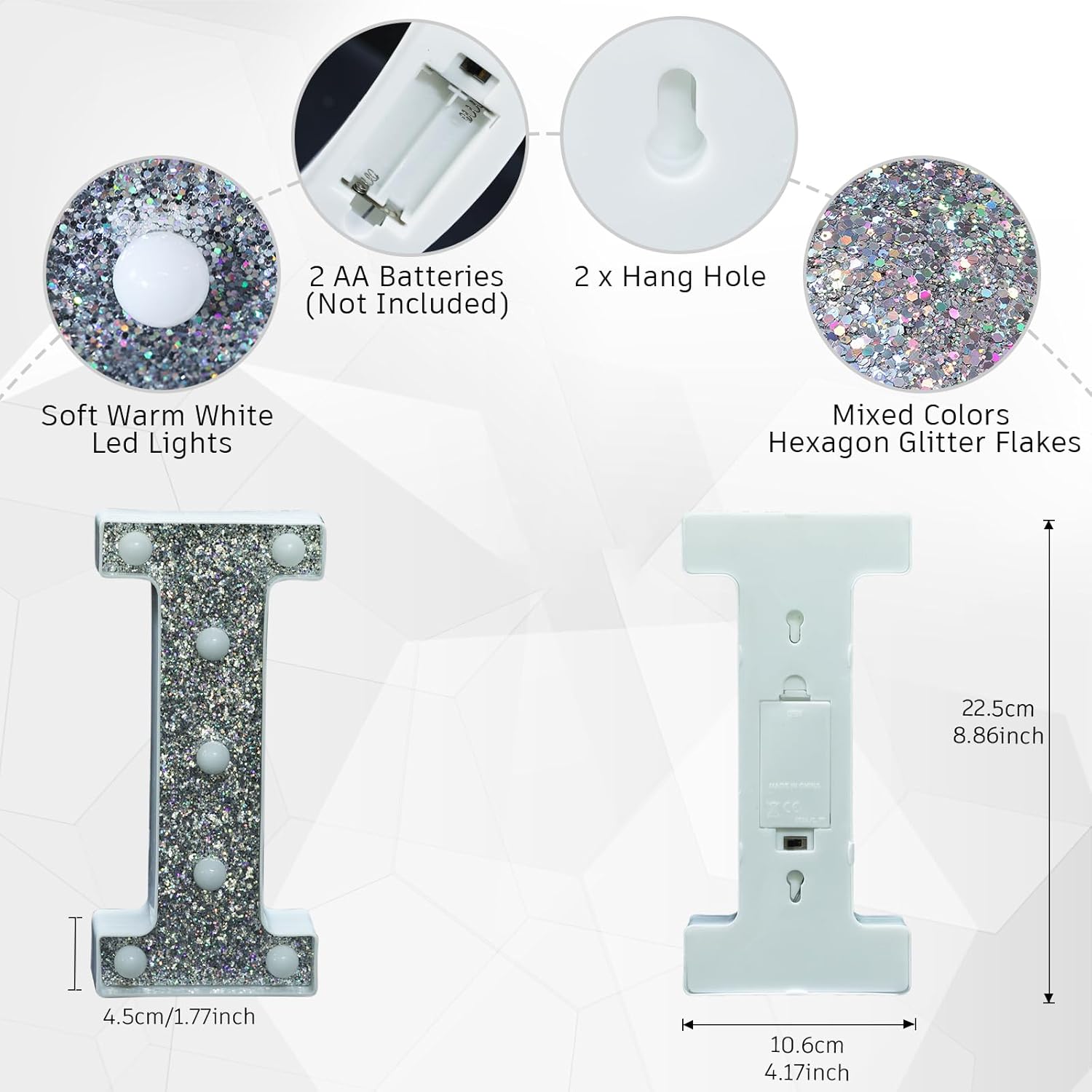 - π‘ Elegant Glitter Light-Up Letters with Silver Diamond Finish: These LED marquee light up letters feature a stunning glitter effect combined with a sophisticated silver diamond surface. Including all 26 alphabet letters and 10 numbers, these light up letters bring sparkle and elegance to any space, making them the perfect light letters for party decor, especially as light up letters for table settings or wall accents.