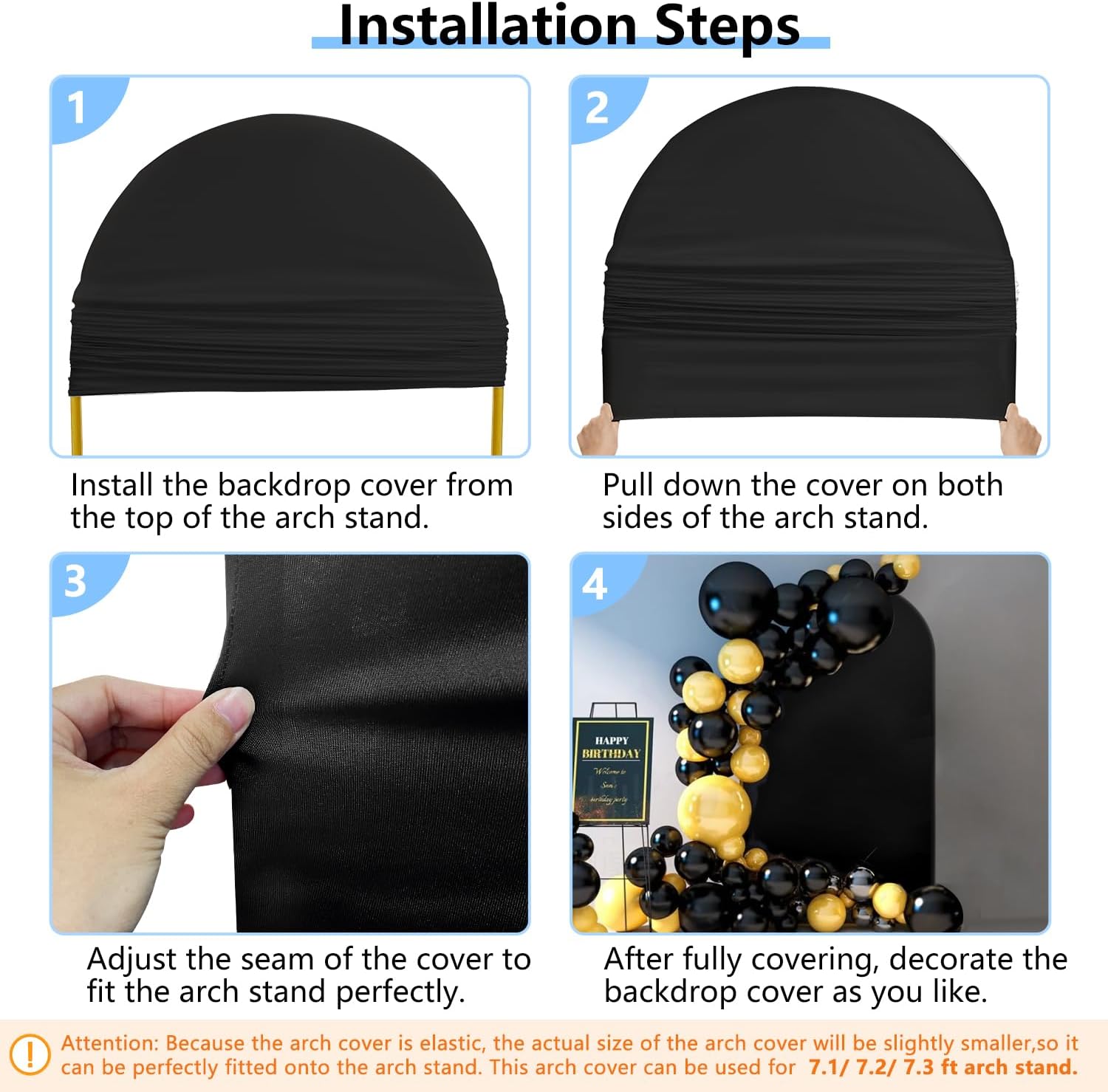 - Attention: ⚠️ This package only includes one piece of arch cover. Arch stand is not included. ⚠️ Please confirm the arch stand size you have on hand and the stand size that our arch fabric is suitable for before purchasing