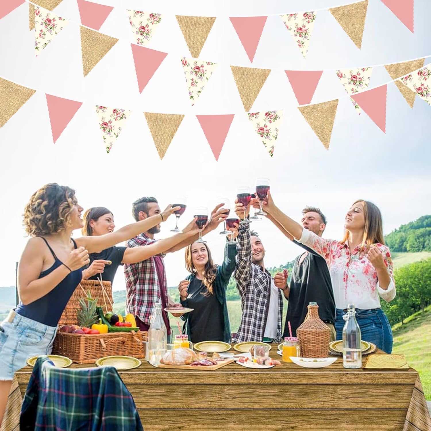 32Ft Flora Party Decorations Blush Rose Pink Burlap Flora Triangle Flag Fabric Banner Pennant Garland Streamer for Chic Tea Party Vintage Birthday Wedding Baby Shower Engagement Rustic Garden Decor