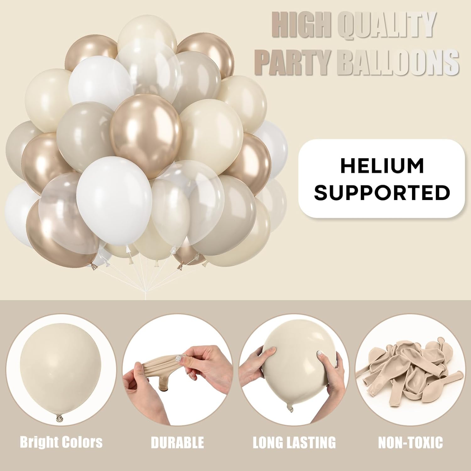 - ๐12INCH BEIGE GOLD BALLOONS: The package includes 60 pcs 12 inch balloons: 15 pcs white sand balloons, 15 pcs white balloons, 15 pcs ivory white balloons, 9 pcs champagne gold balloons, 6pcs clear balloons and 1pc 10m ribbon. Enough quantity and different colors for satisfying your various decoration needs!