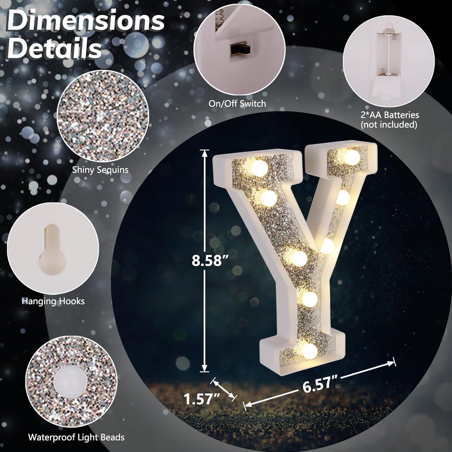 Marquee Light Up Letters, Glitter Silver LED Letter Lights Battery Powered Alphabet Letter Sign for Night Light Wedding Birthday Party Cafe Bar Decoration Girls Room Decor - Y