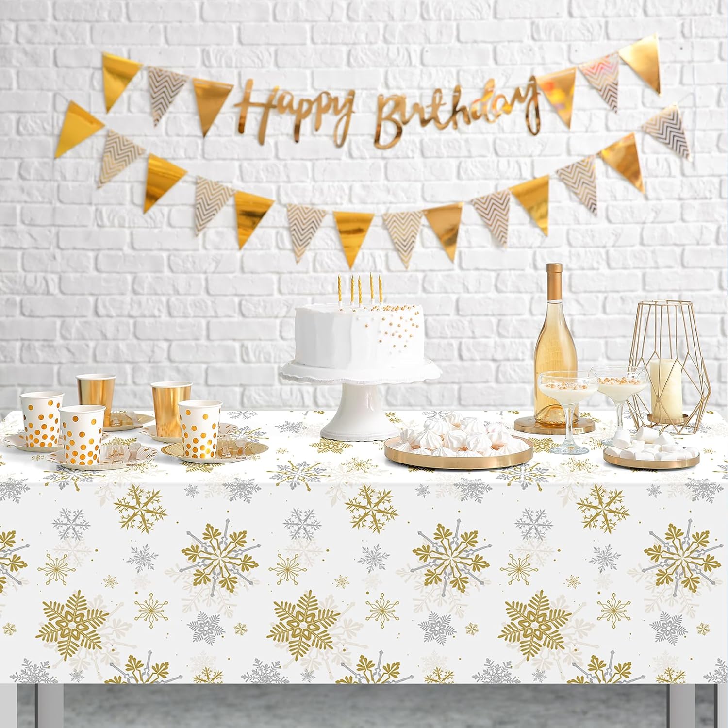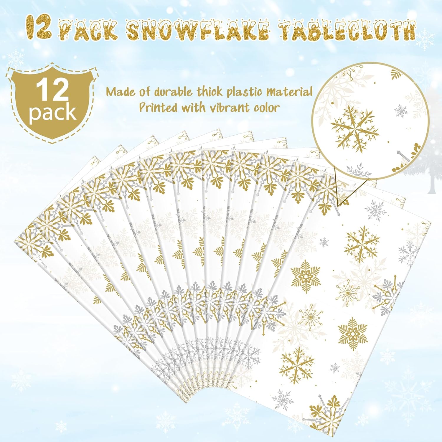 - What will you receive: 12 pieces white and gold Christmas plastic party tablecloth,all over printed with gold and silver snowflake patterns on pure white backdrop,ideal for decorating your winter holiday and Christmas party supplies and decorations