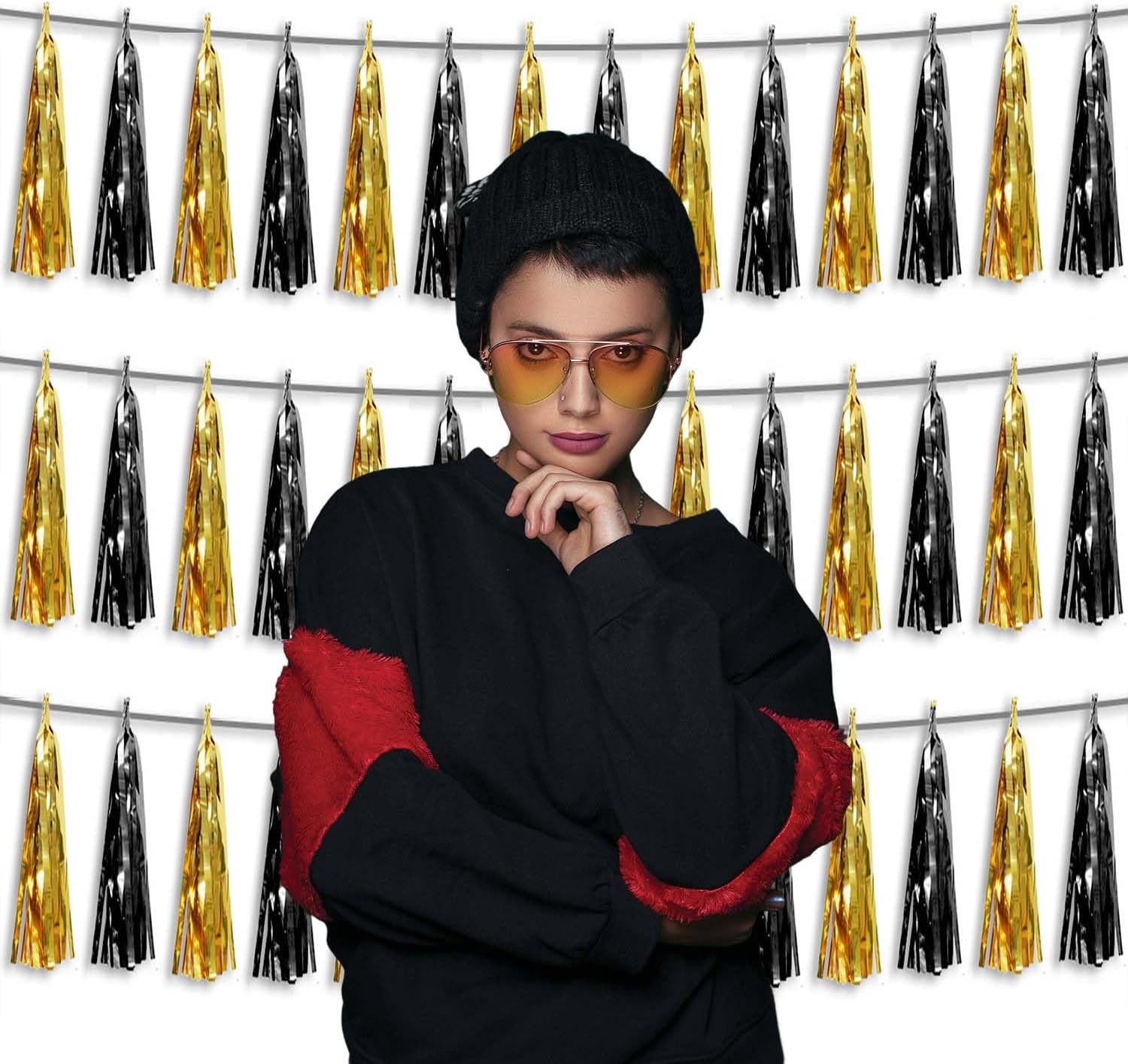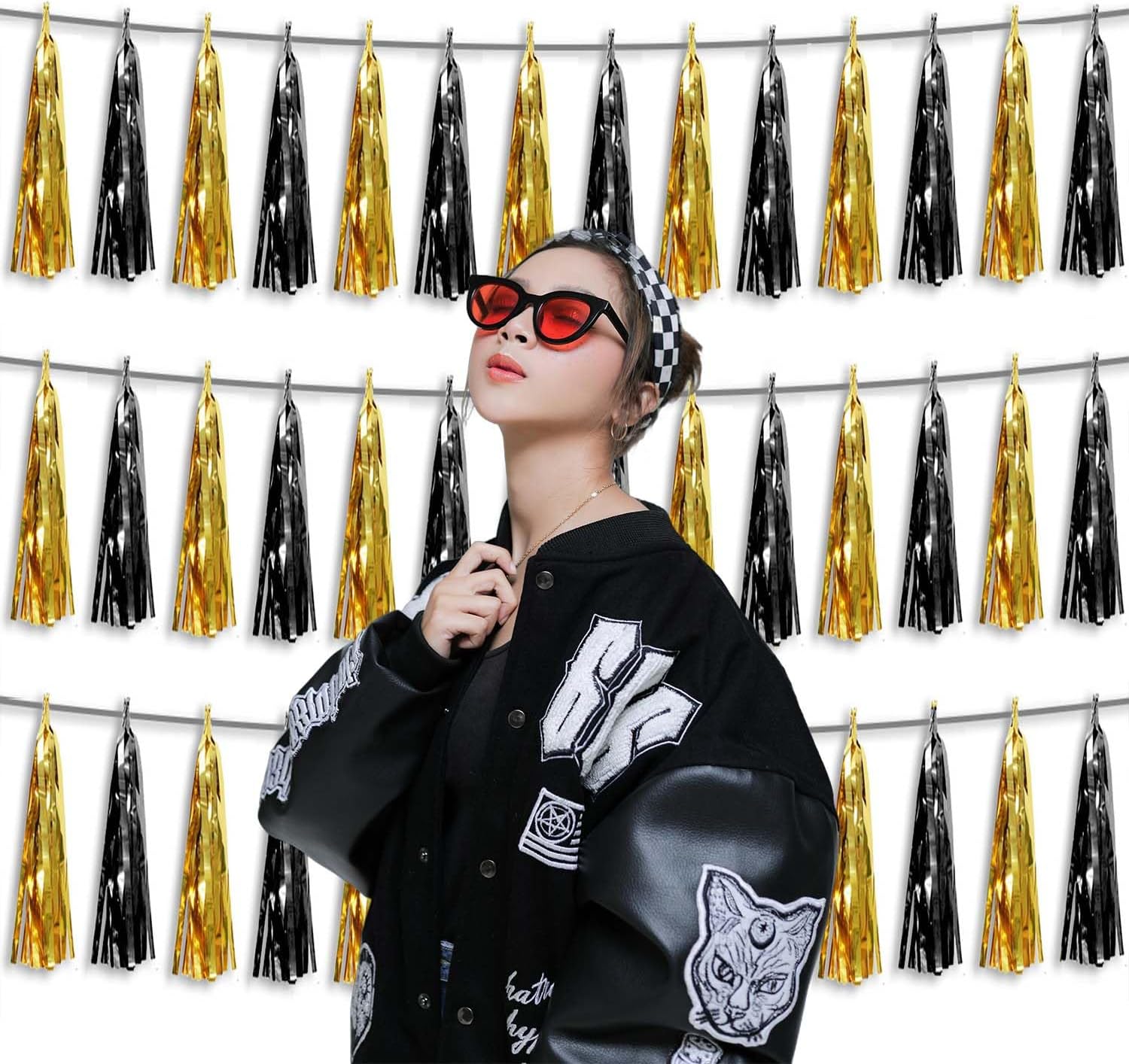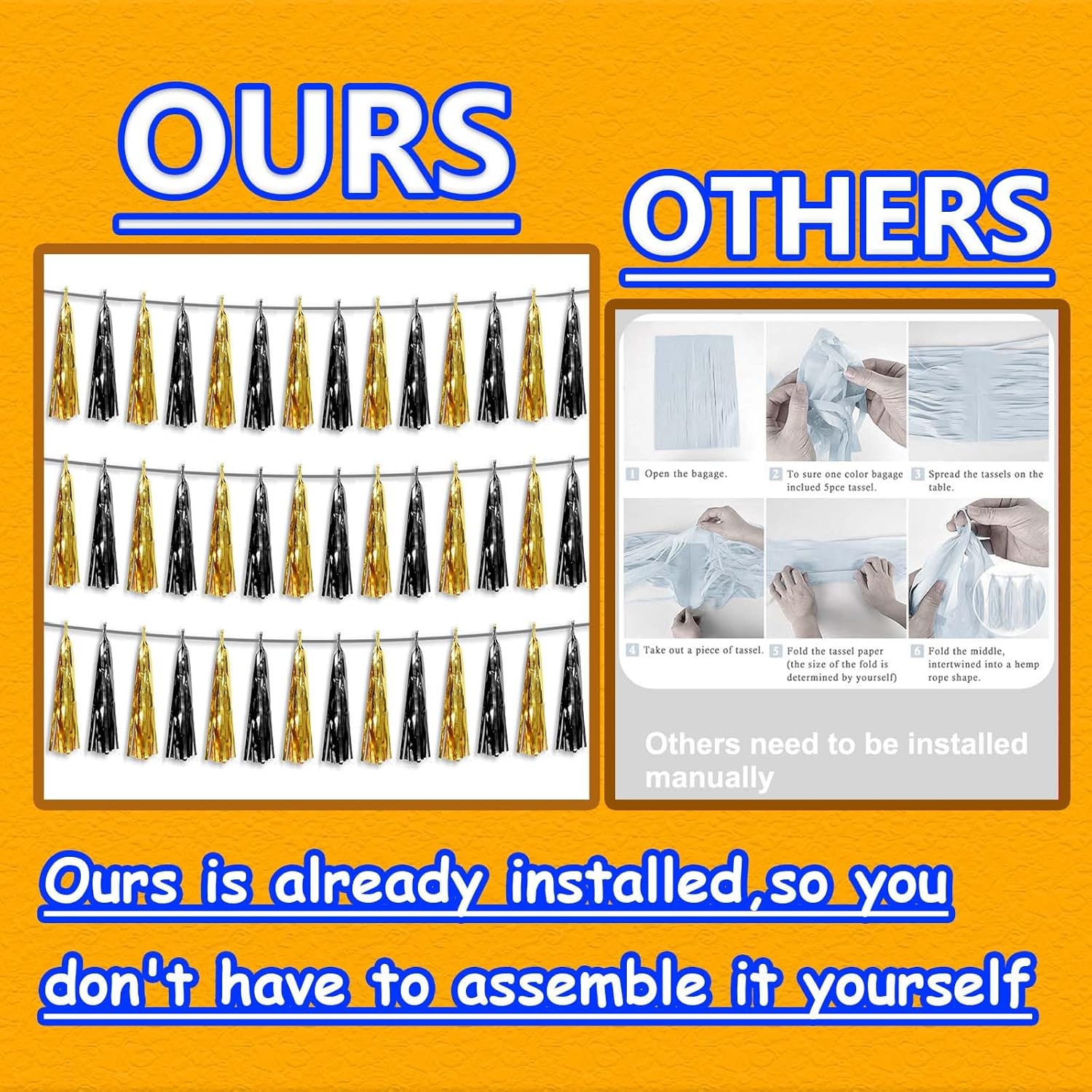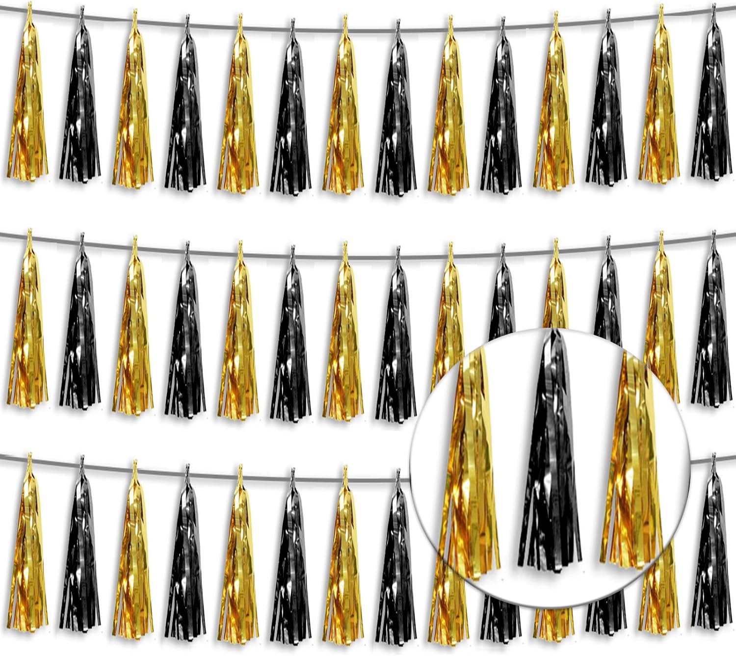 - 【Package Includes】The total length of the black gold birthday tassels banner is 30 feet, divided into 3 strips, each 10 feet long. Each banner contains 15 tassels, and each tassel measures 14 inches, for birthday decorations many occasions uitable for Patriotic display, Homecoming Float, Christmas Float, ecorative metal trailers, graduation floats etc
