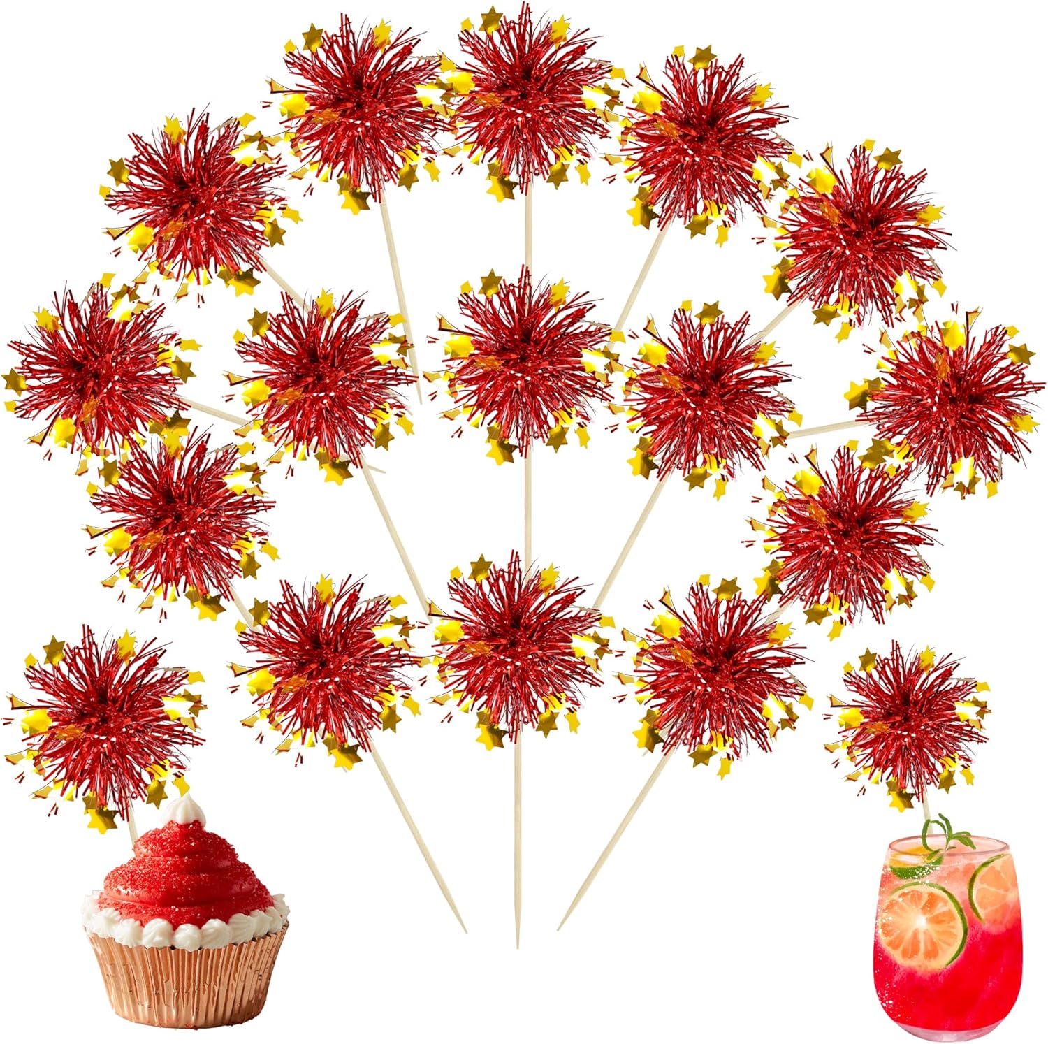 Ephlyn 30Pcs Foil Firework Cupcake Toppers Party Birthday Cake Toppers Supplies Sparkle Tinsel Cocktail Fruit Toothpick for Birthday Wedding Graduation Party Red