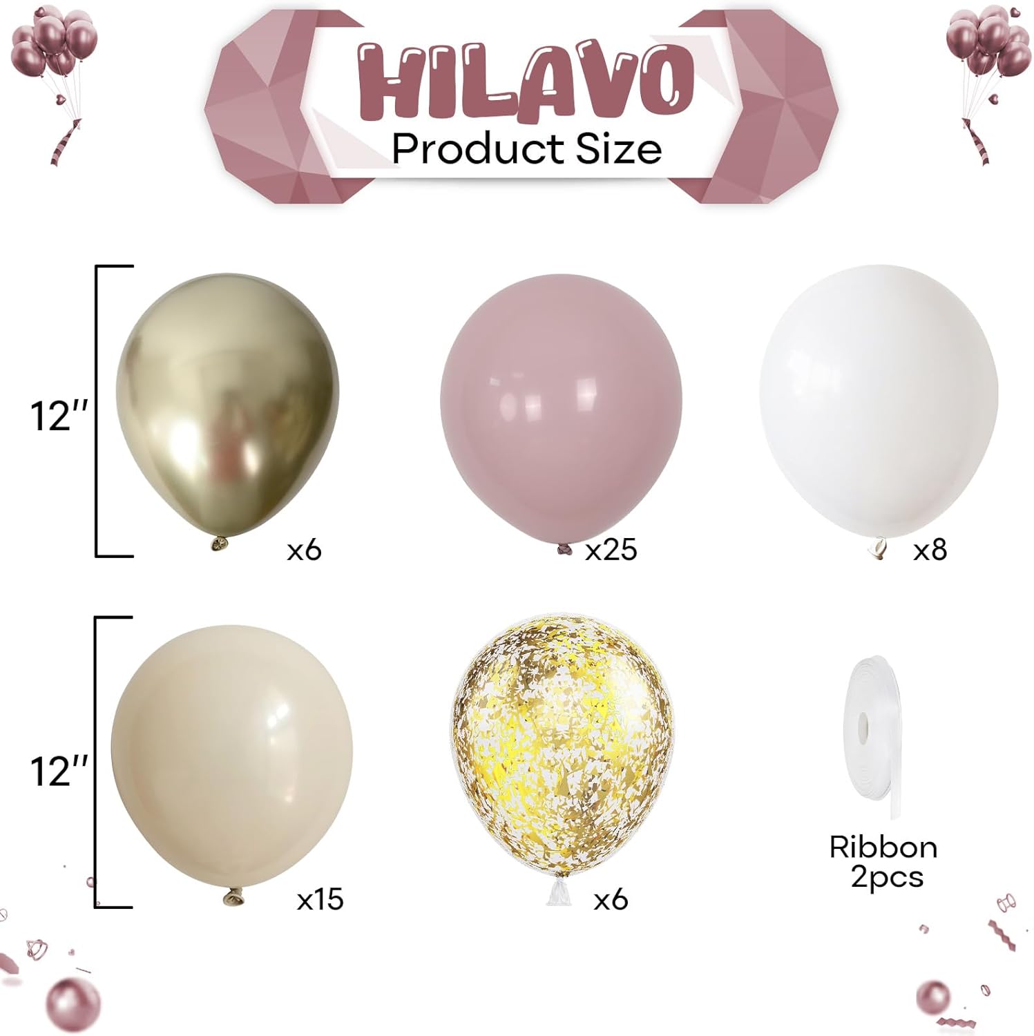 - ๐ธ Dusty Pink and Gold Balloons Set: This is a beautiful bright balloon, which contains balloons of different colors. Include 12 inch dusty pink balloon(25pcs), retro white sand balloon(15pcs), white balloon(8pcs), metallic gold balloon(6pcs), gold confetti balloon(6pcs), 2 rolls of ribbons. You can use these different shades of fog pink and gold balloon kits, DIY balloon combinations to create your birthday party.