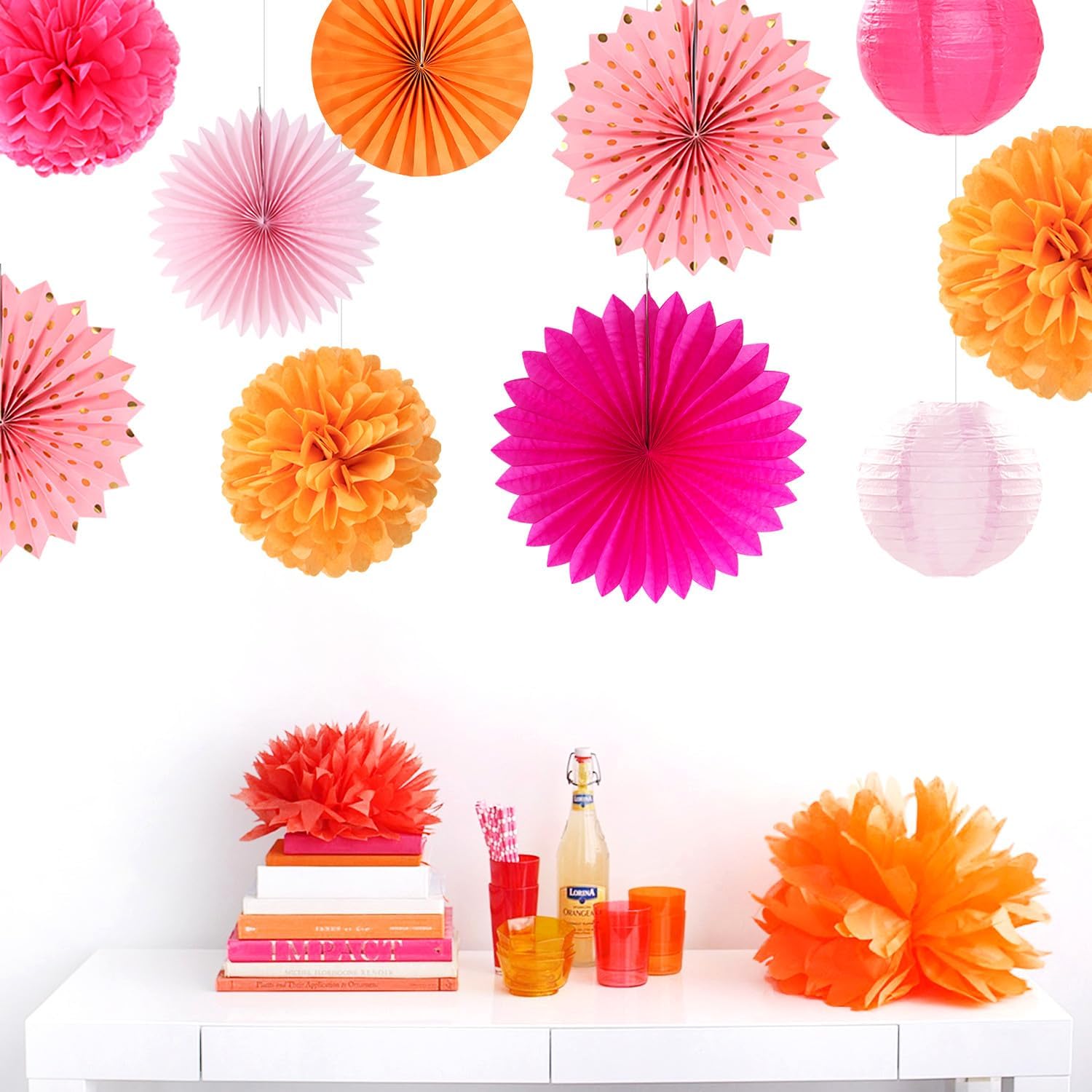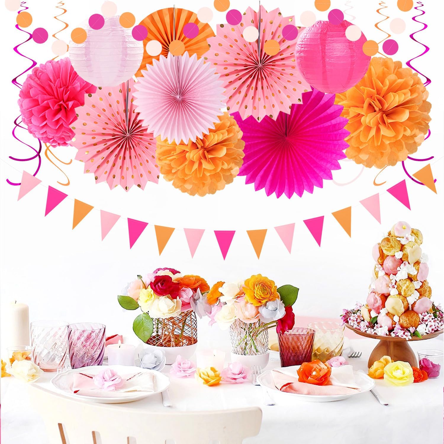 - Package Including:The hot pink burnt orange party decorations 1pcs paper garland dots,1pcs Triangle Flags in three color,15pcs tassel garland in three color,2pcs 8” paper lantern,6pcs streamers in three color,2pcs 10” paper lantern fan,2pcs 10” paper flower in two color,1pcs 12” paper flower,2pcs 12”paper lantern fan,1pcs 16”paper lantern fan.