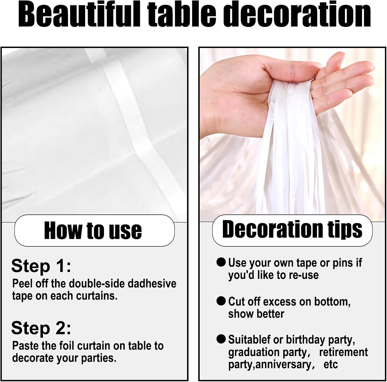 - Easy to Use: the foil fringe table skirts are made of metallic foil, lightweight and easy to use; Each metallic fringe table skirts comes with self-adhesive tape on the top for easy attachment to your wall or table, great for your party venue decoration.