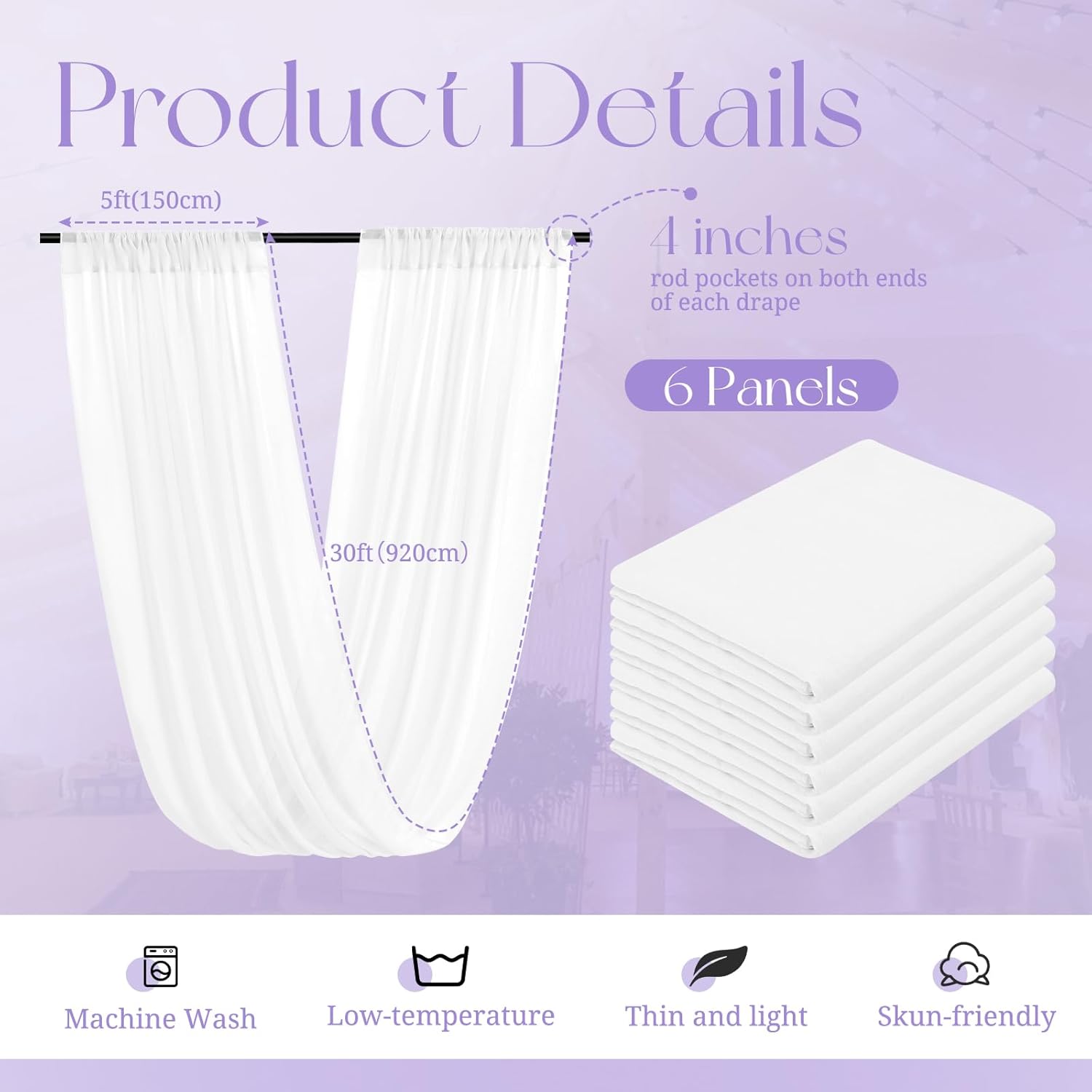 - 【Package Includes】The package will include 6 panels white wedding ceiling drapes (Not include stand), each wedding extra long curtain measures 5 feet (60inch)wide x 30 feet(360inch) long.The sufficient quantity can meet your demands for decorating your weddings, parties, receptions.