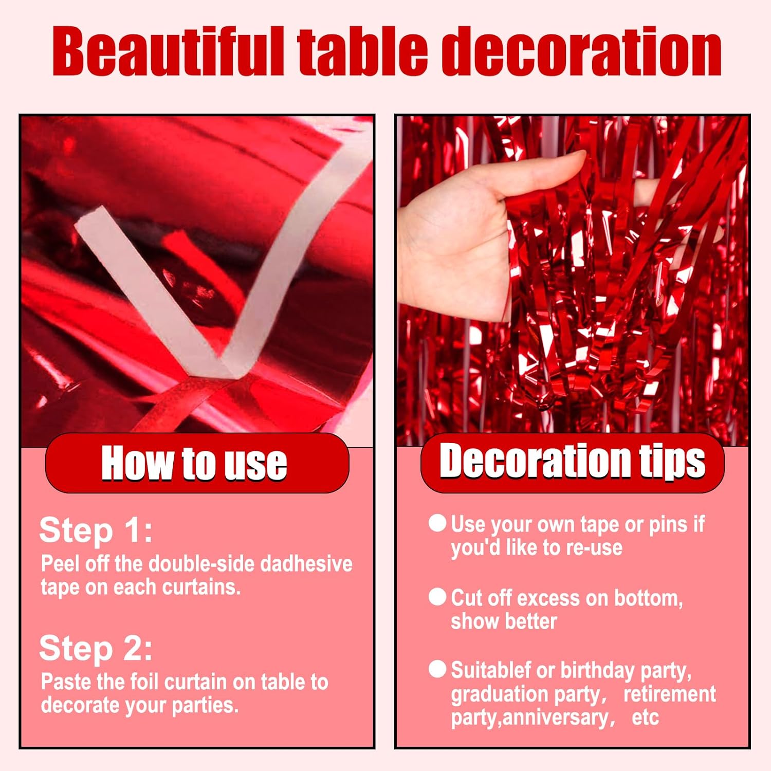 - Easy to Use: the foil fringe table skirts are made of metallic foil, lightweight and easy to use; Each metallic fringe table skirts comes with self-adhesive tape on the top for easy attachment to your wall or table, great for your party venue decoration.