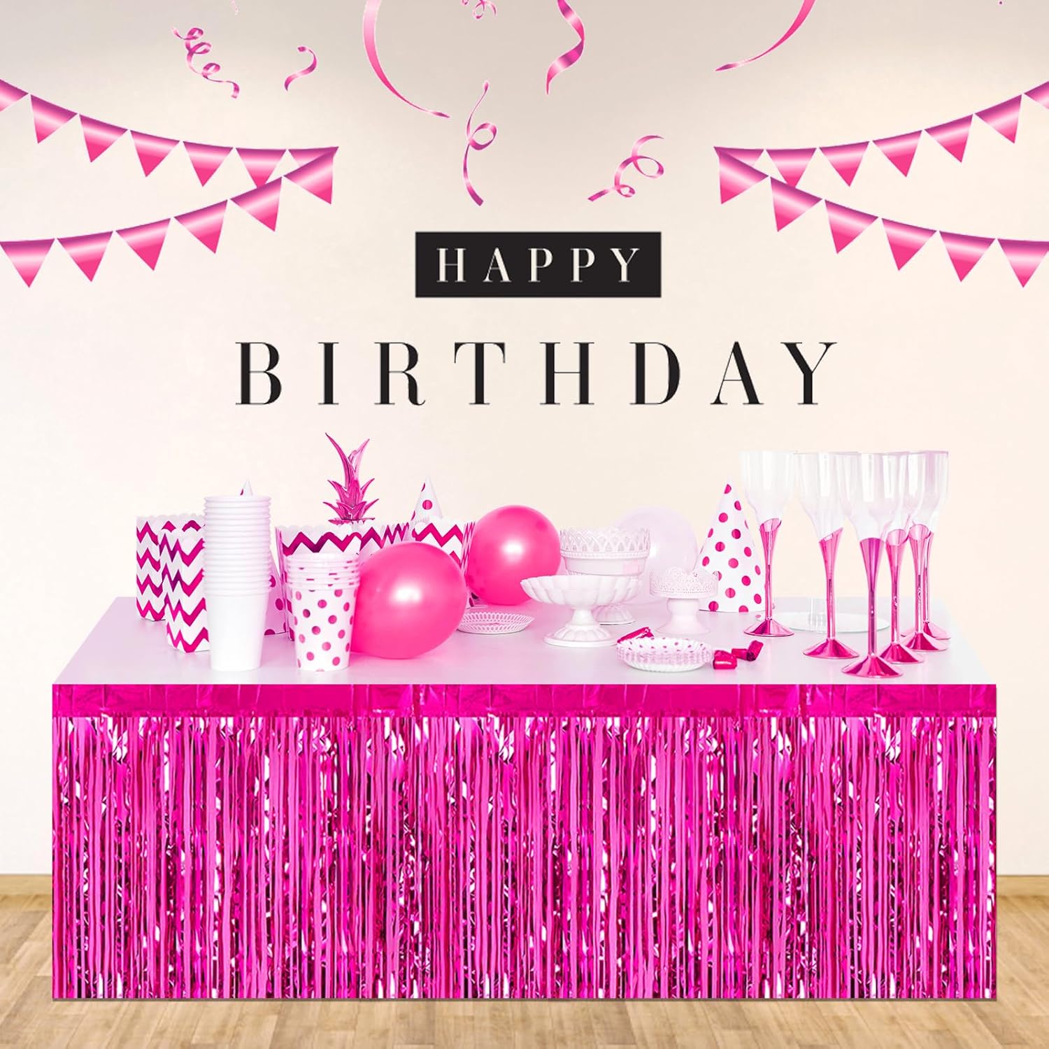 - Easy to Use: the foil fringe table skirts are made of metallic foil, lightweight and easy to use; Each metallic fringe table skirts comes with self-adhesive tape on the top for easy attachment to your wall or table, great for your party venue decoration.