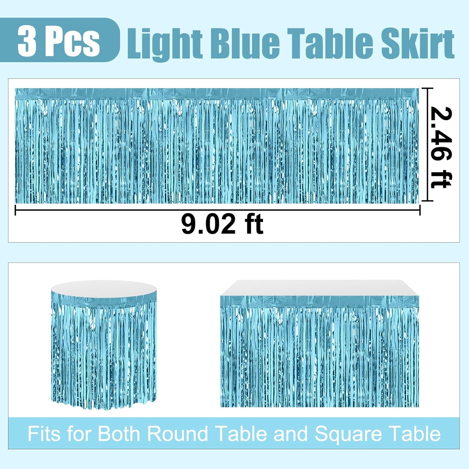 3 Pack 29 x108 Inch Light Blue Foil Fringe Table Skirts Metallic Banner for Tinsel Streamer Garland Backdrop for Parade Floats Wedding Thanksgiving Birthday Christmas New Year Party Decoration