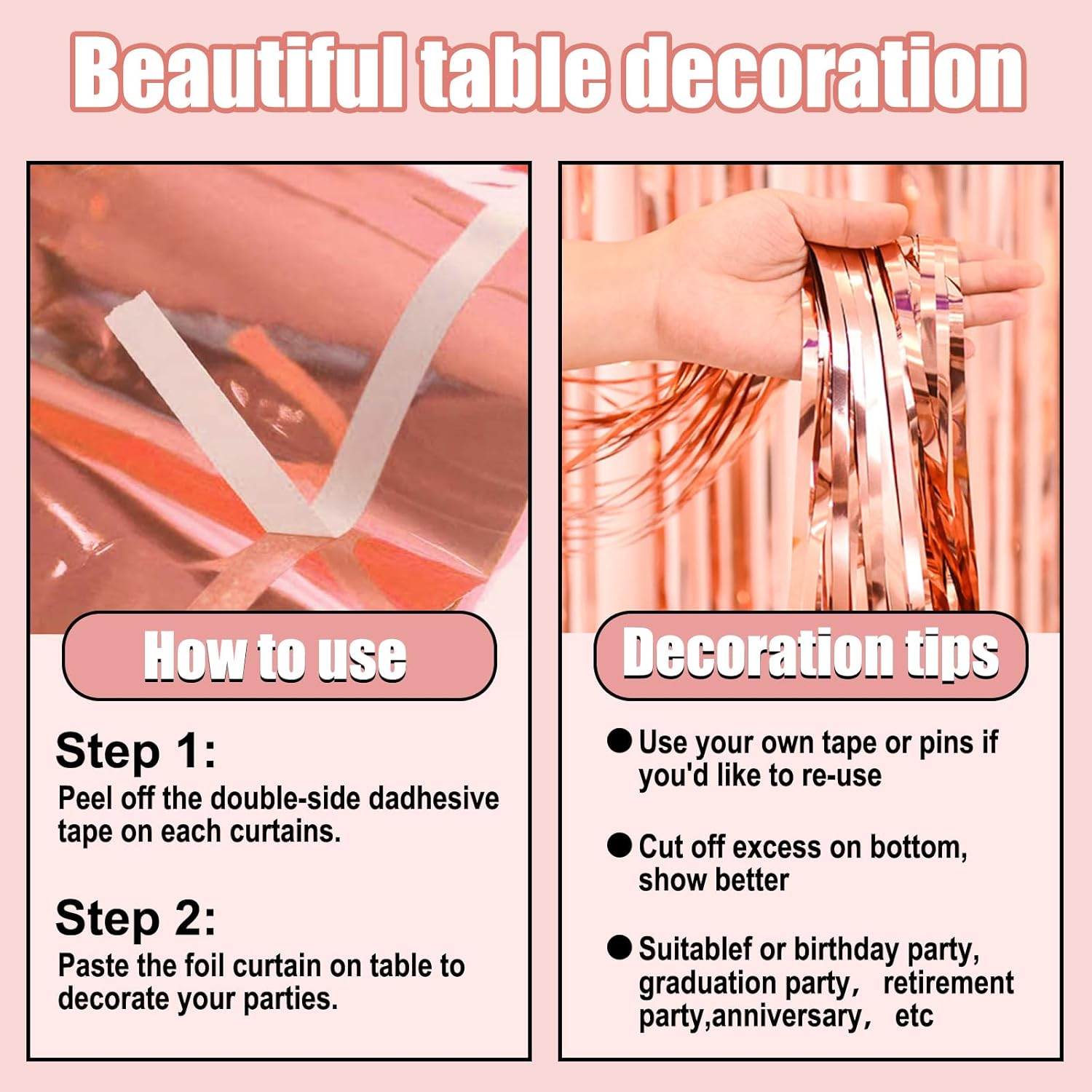 - Easy to Use: the foil fringe table skirts are made of metallic foil, lightweight and easy to use; Each metallic fringe table skirts comes with self-adhesive tape on the top for easy attachment to your wall or table, great for your party venue decoration.