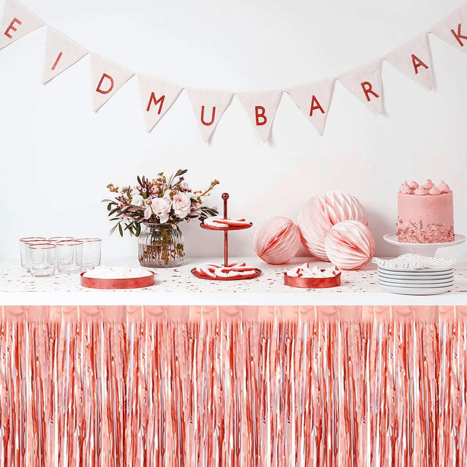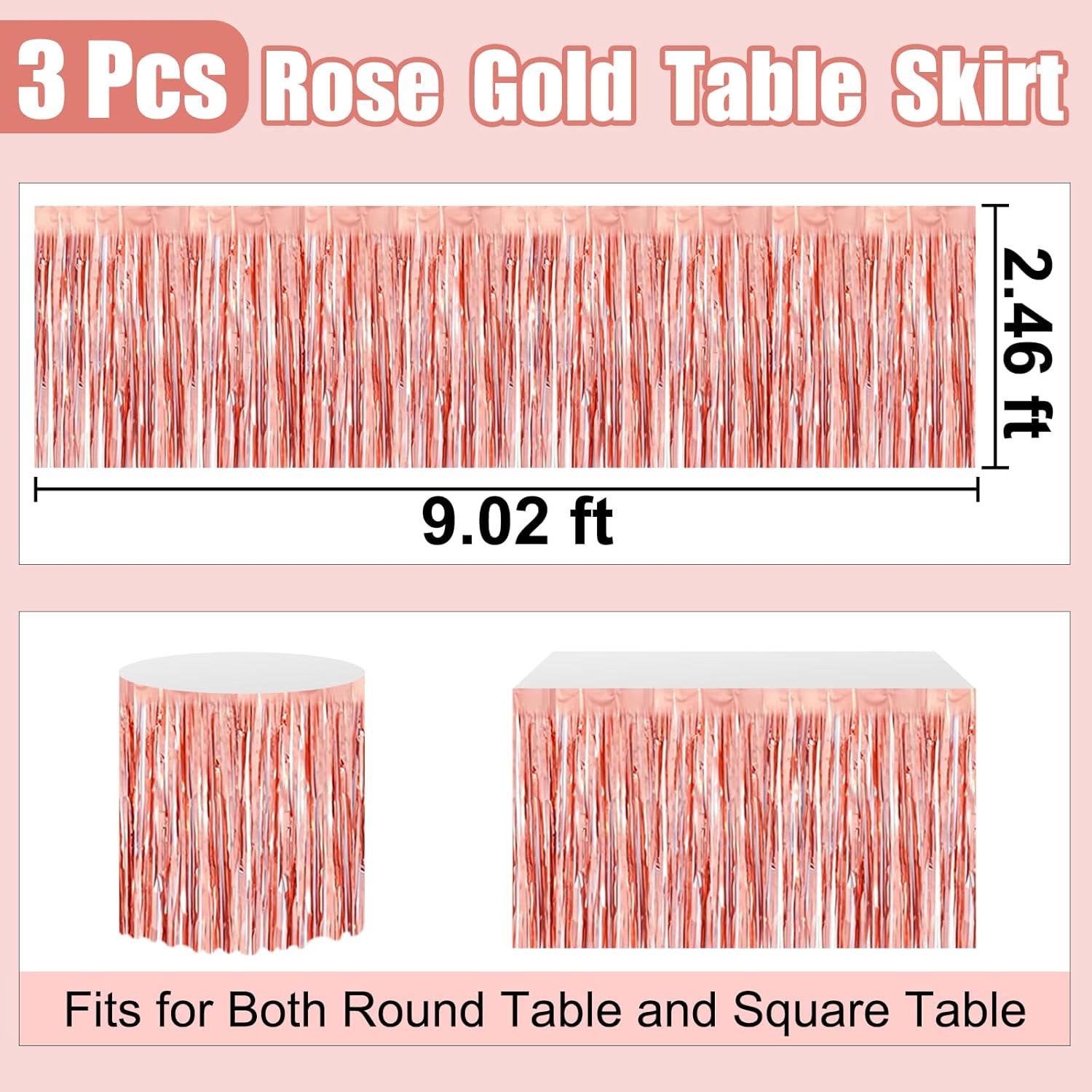 3 Pack 29 x108 Inch Rose Gold Foil Fringe Table Skirts Metallic Banner for Tinsel Streamer Garland Backdrop for Parade Floats Wedding Thanksgiving Birthday Christmas New Year Party Decoration