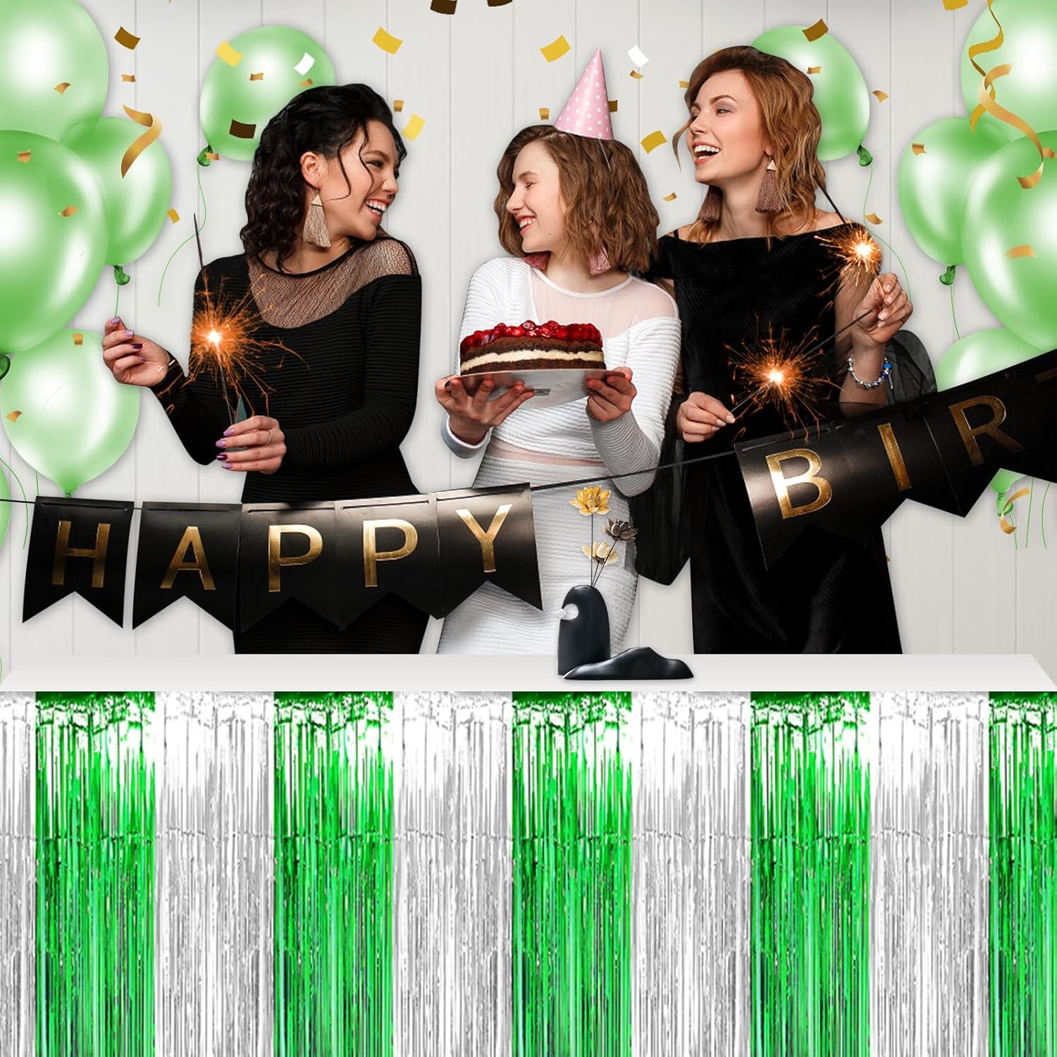 3 Pack 29 x108 Inch Silver Green Foil Fringe Table Skirts Metallic Banner for Tinsel Streamer Garland Backdrop for Parade Floats Wedding Thanksgiving Birthday Christmas New Year Party Decoration