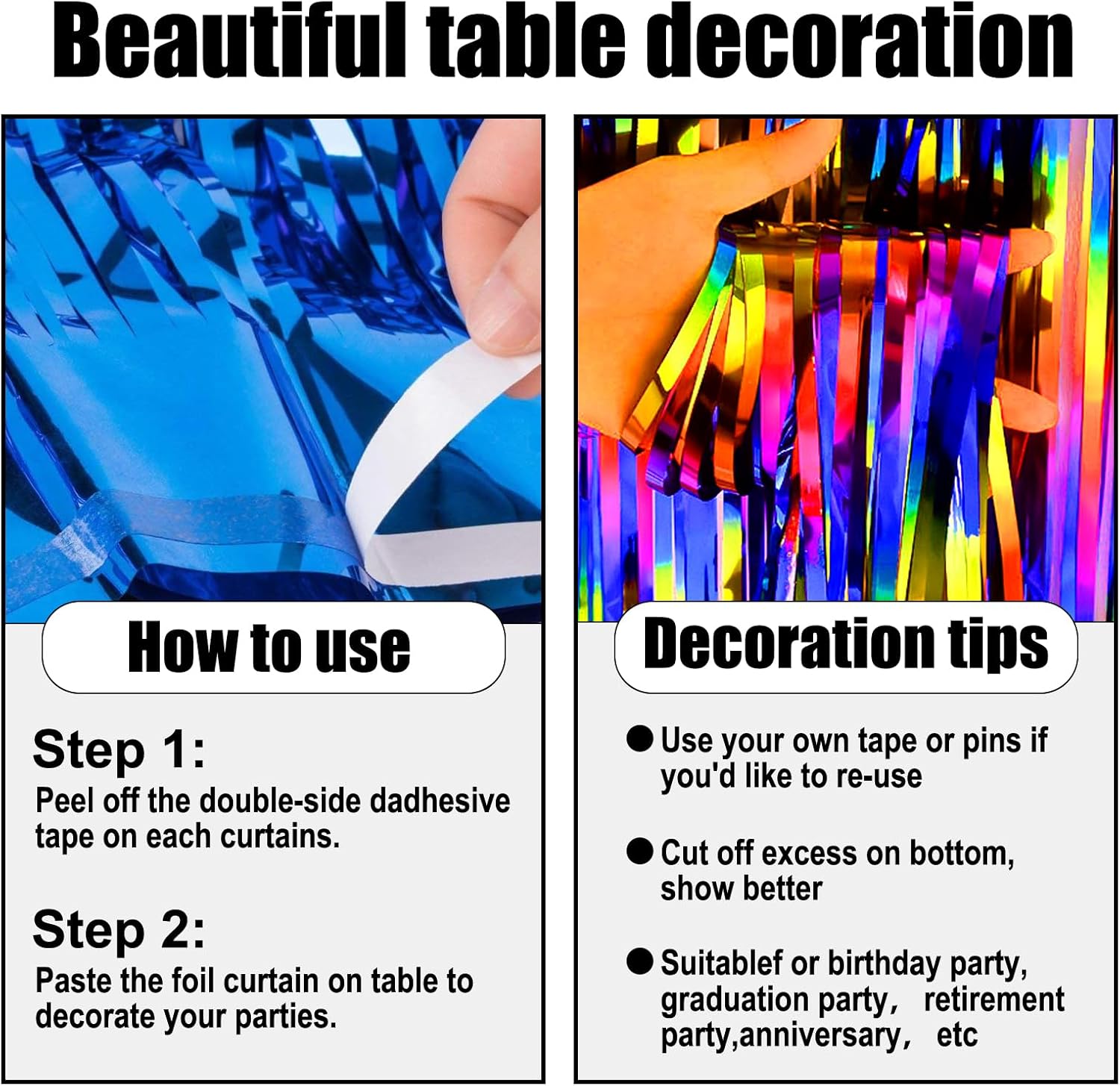 - Easy to Use: the foil fringe table skirts are made of metallic foil, lightweight and easy to use; Each metallic fringe table skirts comes with self-adhesive tape on the top for easy attachment to your wall or table, great for your party venue decoration.