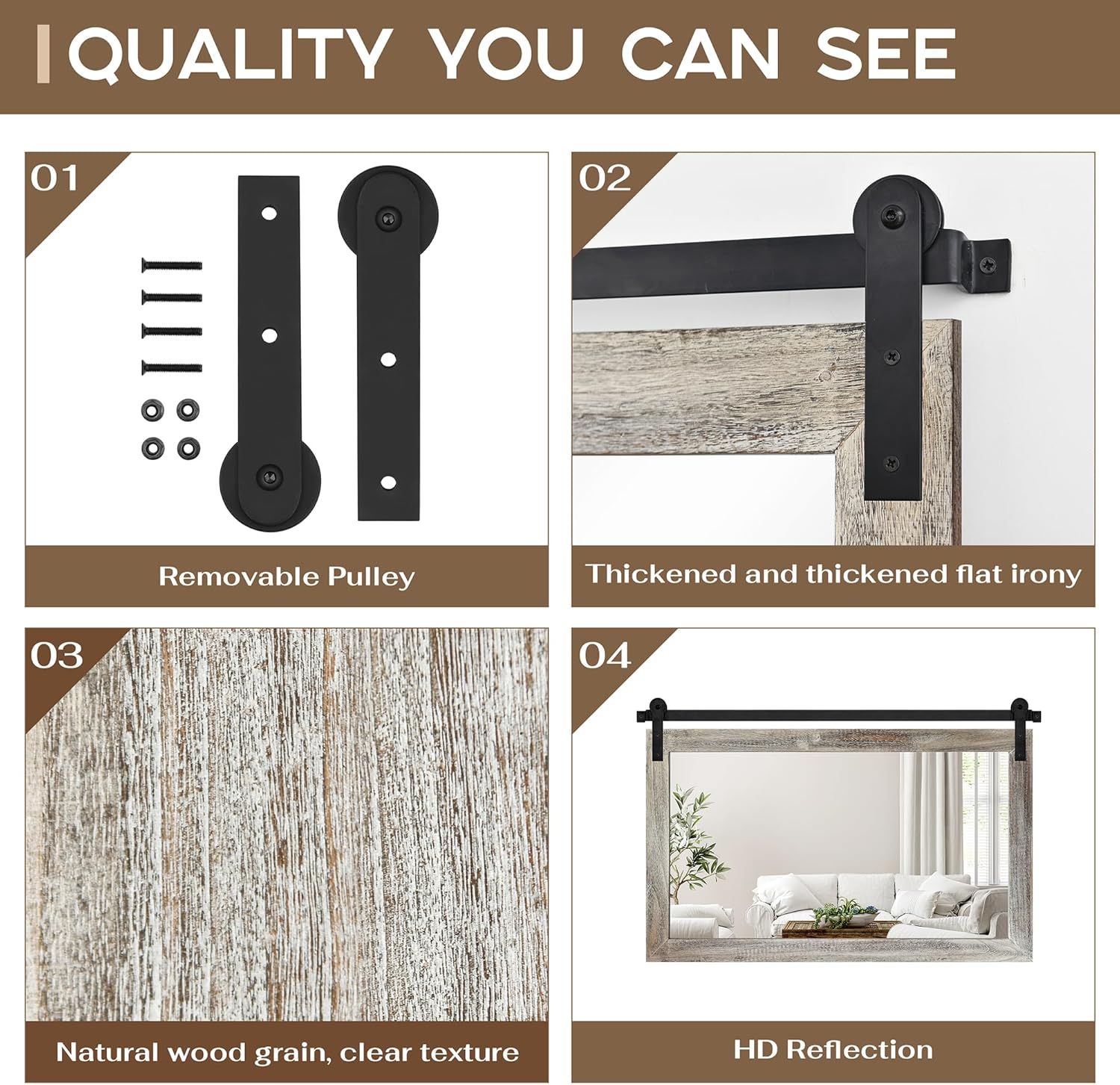 - QUALITY MATERIALS: The frame of the barn door mirror consists of an antique solid wood frame and a sturdy metal bracket. The interior features a 4mm HD silver mirror with clear and distortion-free reflections, providing a better sense of light and projection in your space