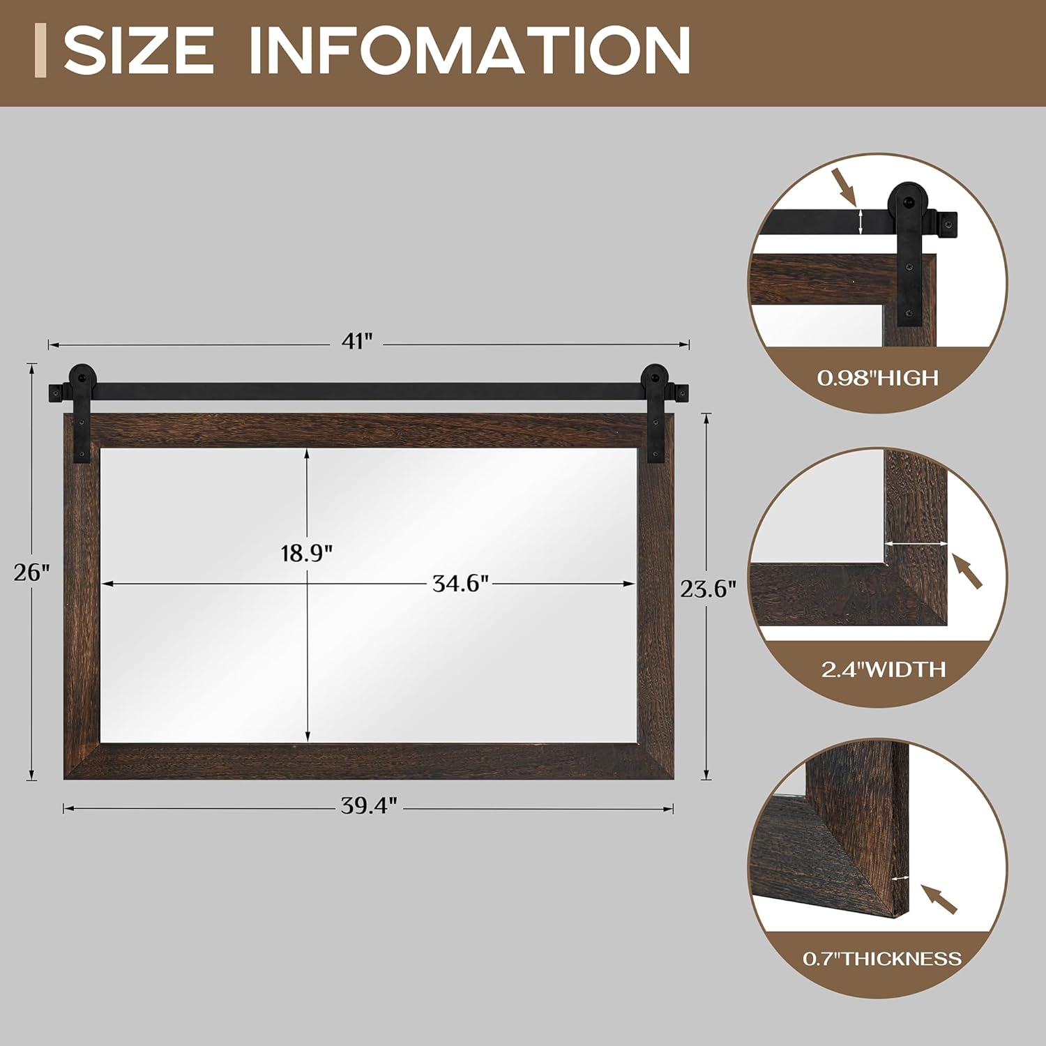 - EASY TO INSTALL: The overall size of this rustic mirror is 40.9 x 26 x 0.67 inch, and the display size of the mirror is 34.6 x 18.9 inch. The track is 41 inch. You can fix the pulleys to the mirror first, then mount the track on the wall and finally snap the pulleys onto the track to complete the hanging