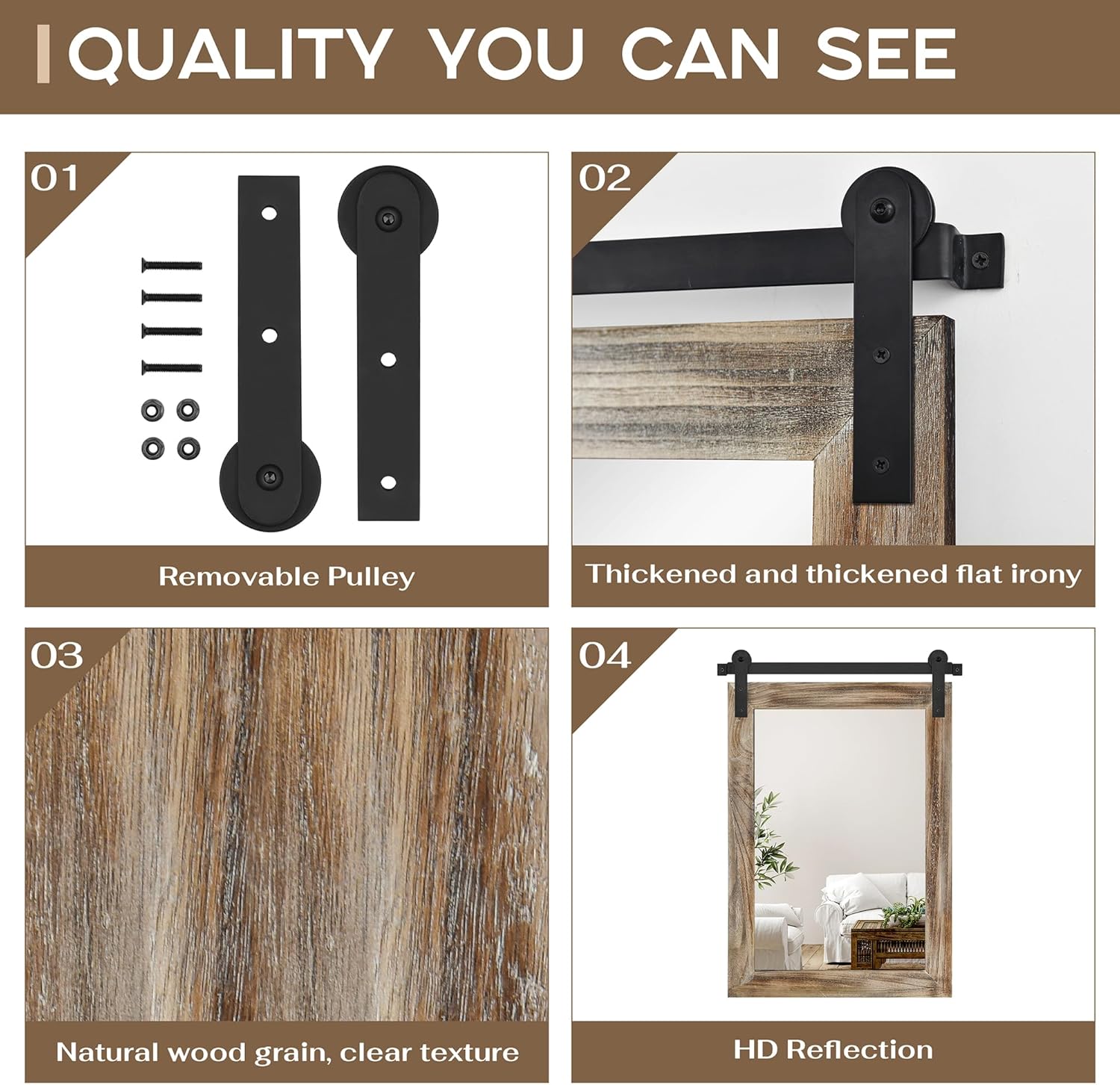- QUALITY MATERIALS: The frame of the barn door mirror consists of an antique solid wood frame and a sturdy metal bracket. The interior features a 4mm HD silver mirror with clear and distortion-free reflections, providing a better sense of light and projection in your space