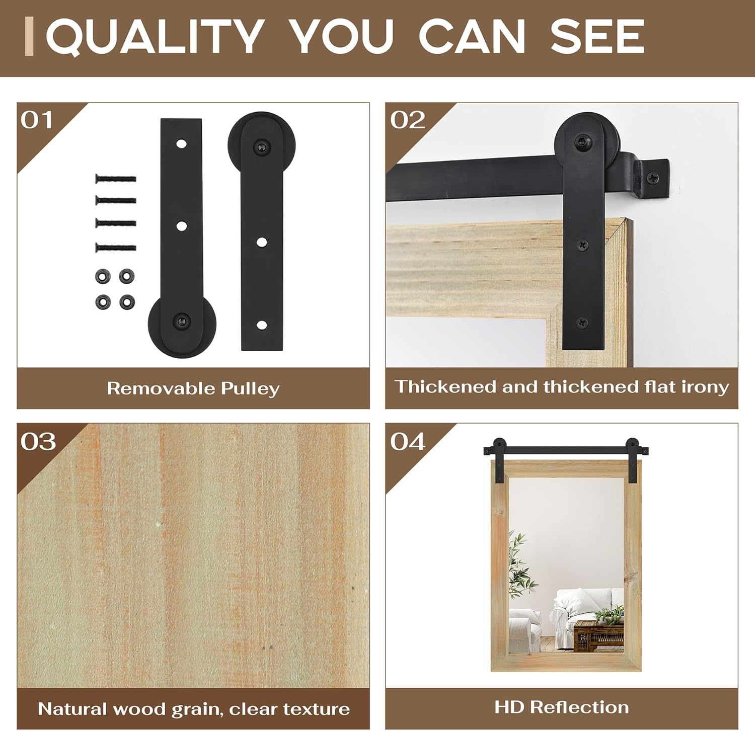 - QUALITY MATERIALS: The frame of the barn door mirror consists of an antique solid wood frame and a sturdy metal bracket. The interior features a 4mm HD silver mirror with clear and distortion-free reflections, providing a better sense of light and projection in your space