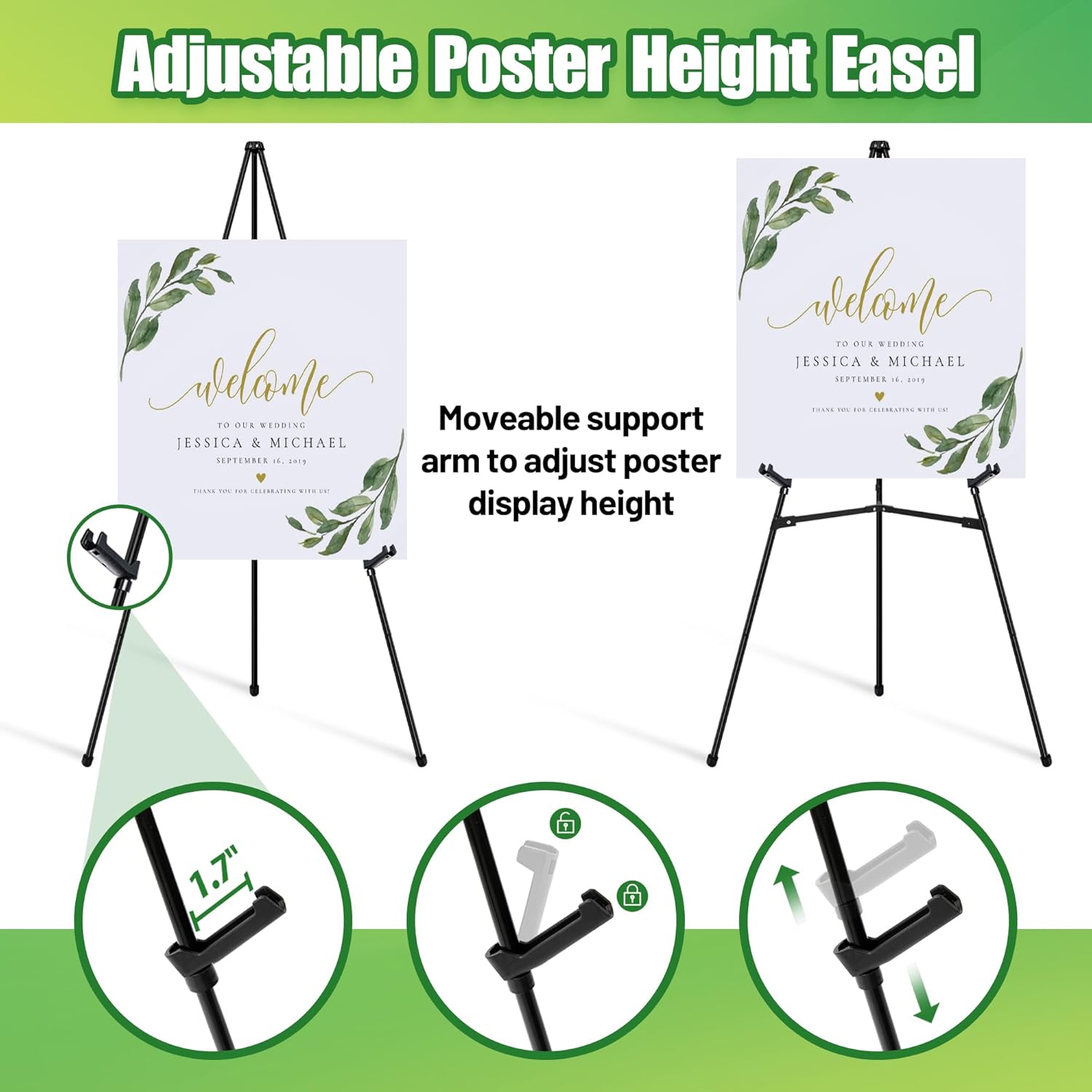 - Adjustable Poster Easel: The easel has two support arms that move up and down to adjust the height of the poster display; supports easel for sign thickness of 1.77 inches
