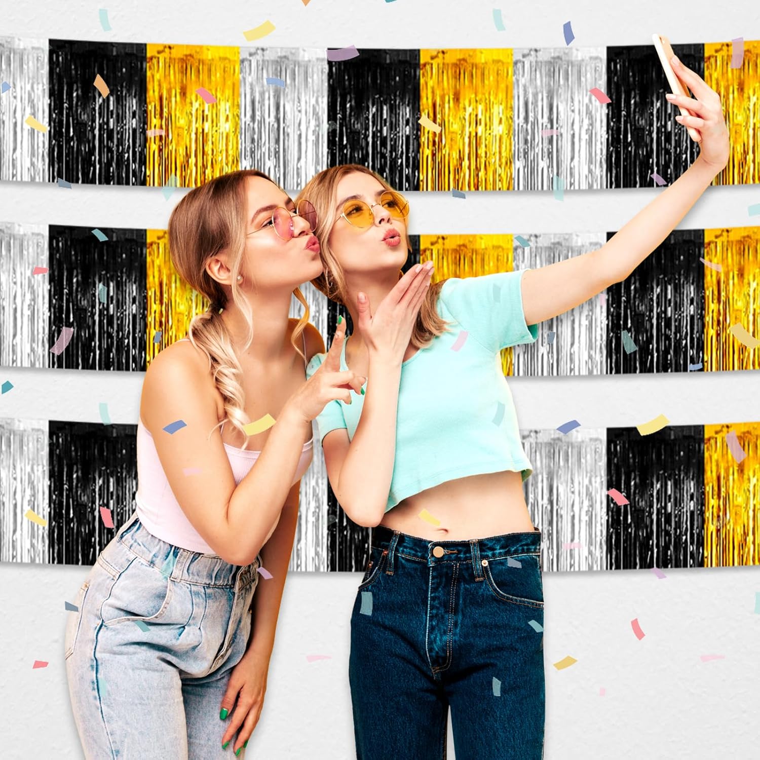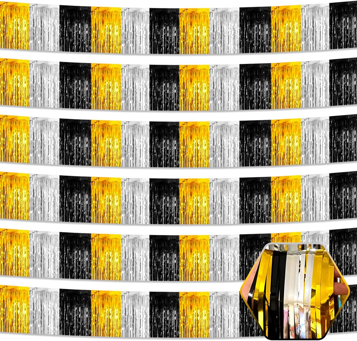 6 Pack 10 Feet Black Gold Silver Foil Fringe Garland Metallic Tinsel Streamers Banner Wall Hanging Curtain Backdrop for Parade Floats, Birthday, Graduate, Mother's Day, Wedding Party Decoration