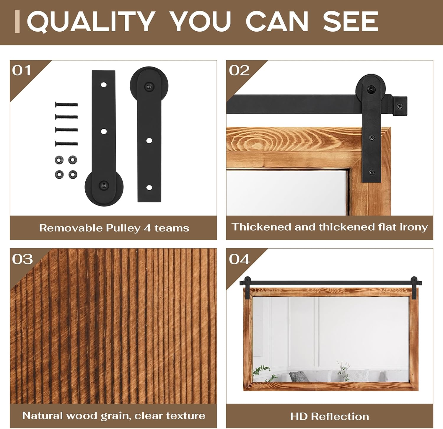- QUALITY MATERIALS: The frame of the barn door mirror consists of an antique solid wood frame and a sturdy metal bracket. The interior features a 4mm HD silver mirror with clear and distortion-free reflections, providing a better sense of light and projection in your space
