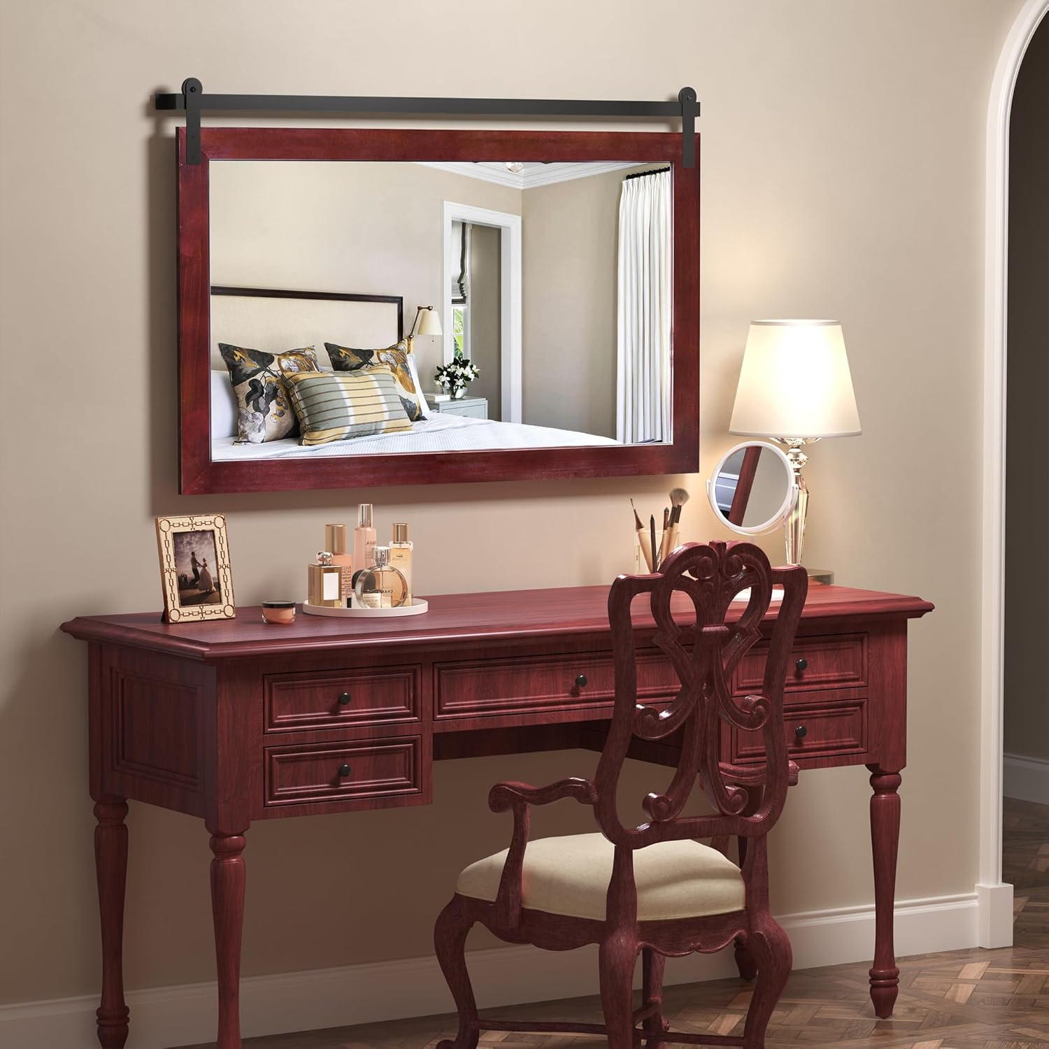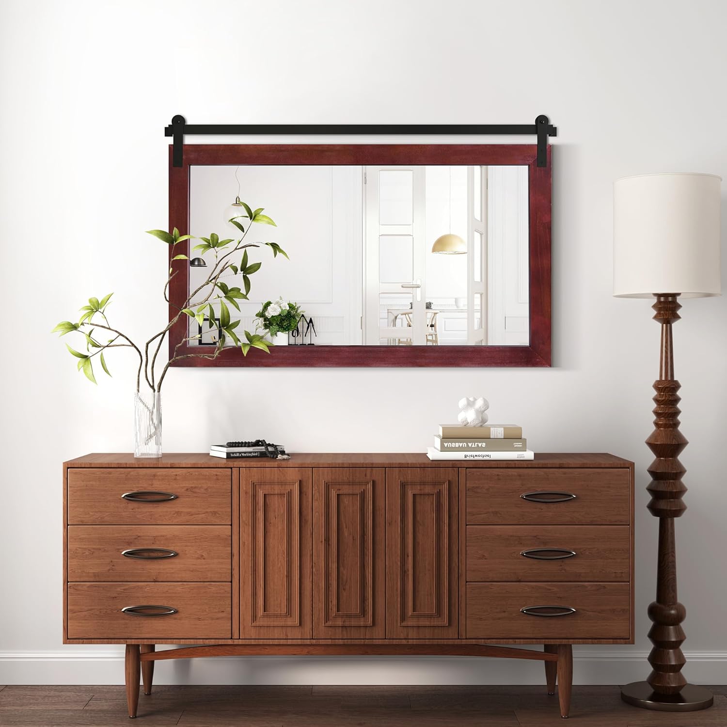 - EASY TO INSTALL: The overall size of this rustic mirror is 44.9 x 29.9 x 0.7 inch, and the display size of the mirror is 38.6 x 22.8 inch. The track is 45 inch. You can first fix the iron bracket on the mirror, then install the track on the wall, and finally the wheels on the iron bracket will be stuck into the track to complete the hanging