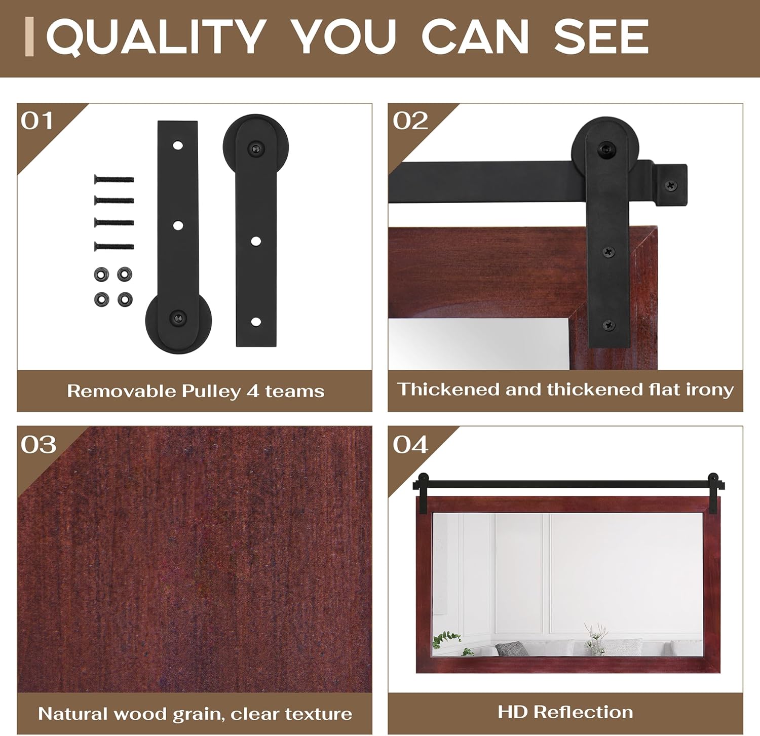 - QUALITY MATERIALS: The frame of the barn door mirror consists of an antique solid wood frame and a sturdy metal bracket. The interior features a 4mm HD silver mirror with clear and distortion-free reflections, providing a better sense of light and projection in your space