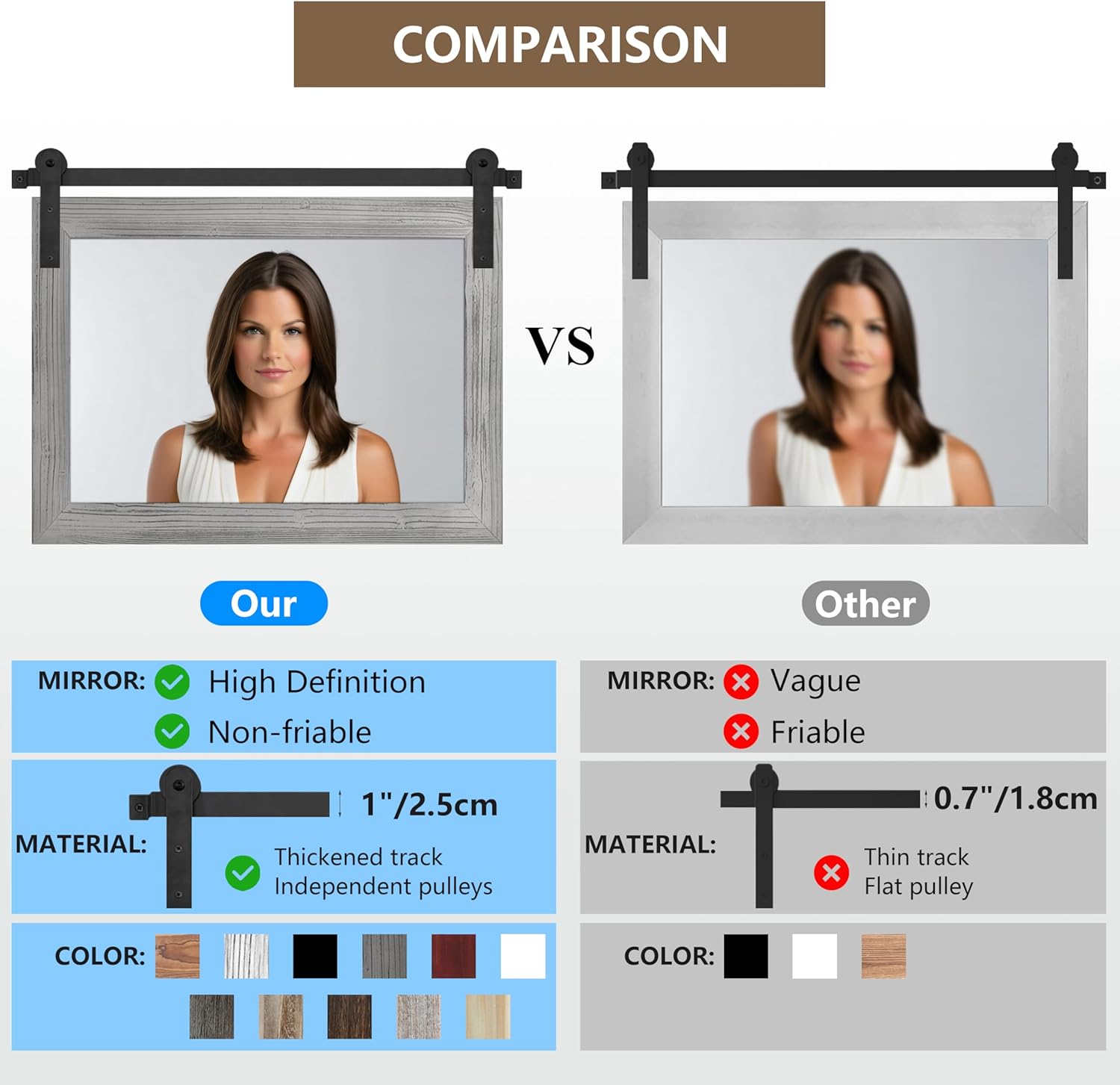 - QUALITY MATERIALS: The frame of the barn door mirror consists of an antique solid wood frame and a sturdy metal bracket. The interior features a 4mm HD silver mirror with clear and distortion-free reflections, providing a better sense of light and projection in your space