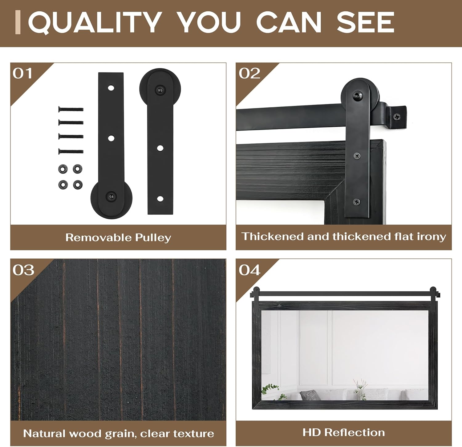 - QUALITY MATERIALS: The frame of the barn door mirror consists of an antique solid wood frame and a sturdy metal bracket. The interior features a 4mm HD silver mirror with clear and distortion-free reflections, providing a better sense of light and projection in your space