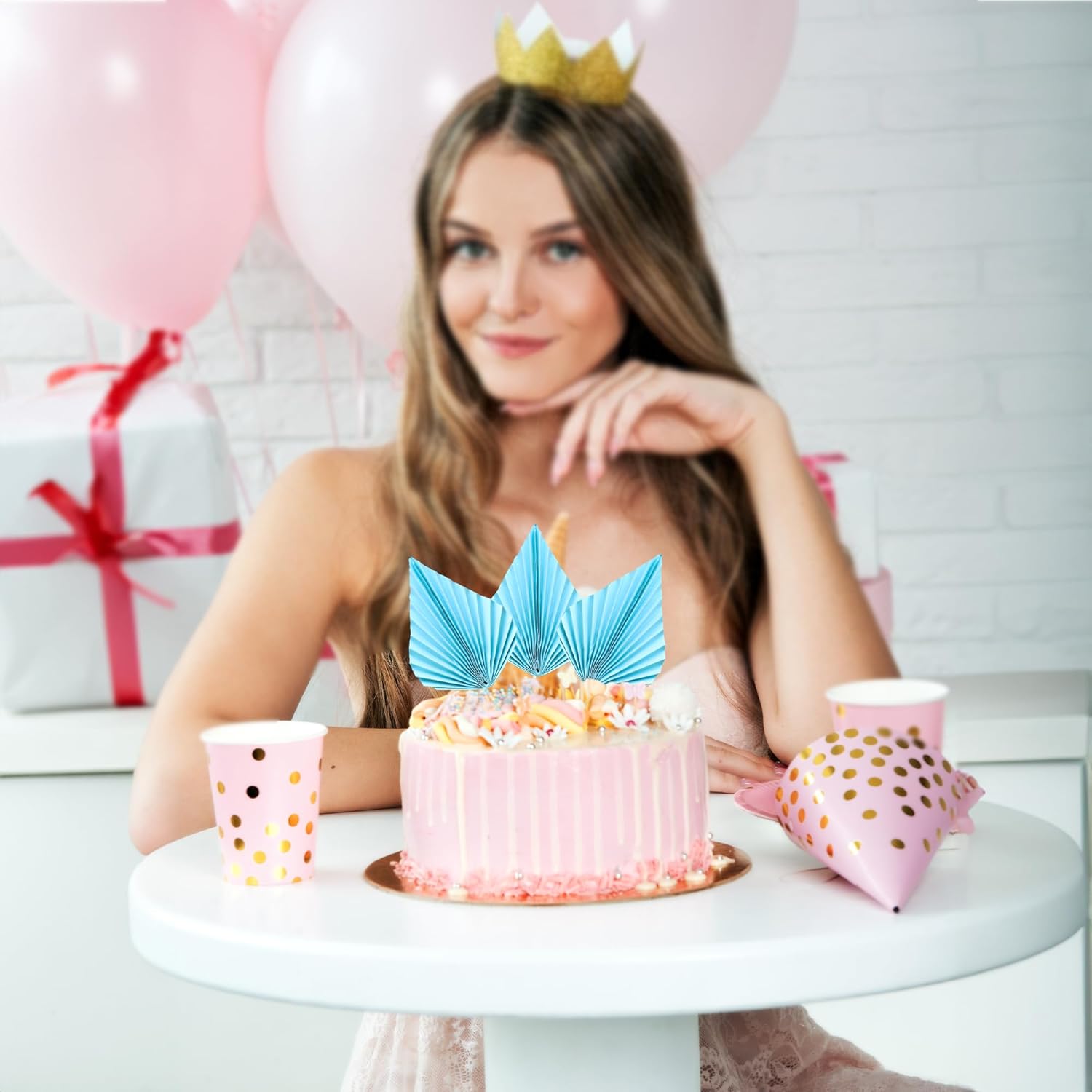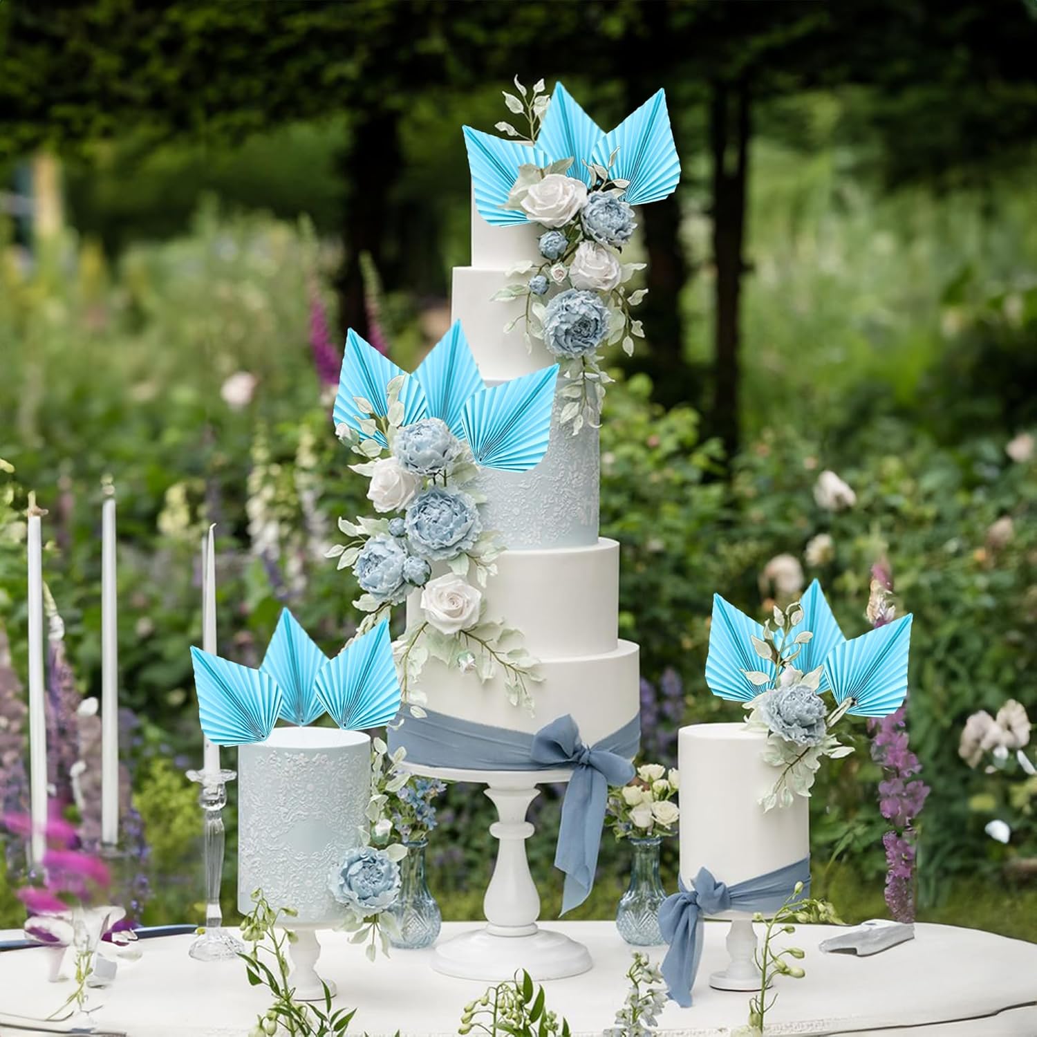 Ephlyn 6Pcs Paper Palm Fan Cake Topper Palm Leaf Fan Cake Pick Decoration for Insert DIY Craft Project Home Made Wedding Bridal Shower Birthday Anniversary Party Cake Decorations Blue