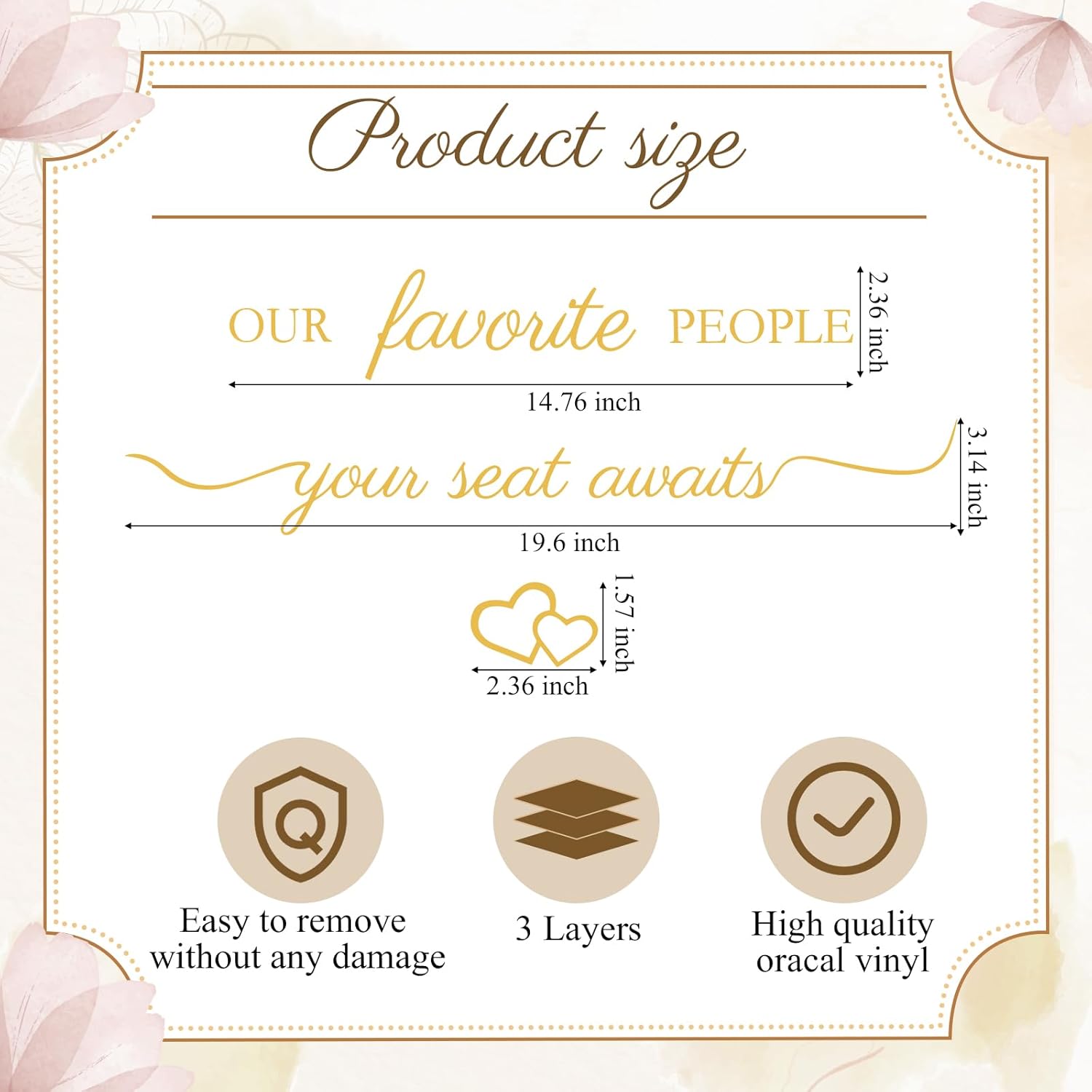 - Ideally Sized for Convenience: these wedding seating chart stickers boast 3 components; 'Our favorite people' measuring about 14.76 x 2.63 inches, 'Your Seat Awaits' sizing to about 19.69 x 2.72 inches, and a charming 'heart' roughly 1.57 x 2.36 inches; These dimensions ensure the decal fits well onto various surfaces while ensuring visibility and attractiveness